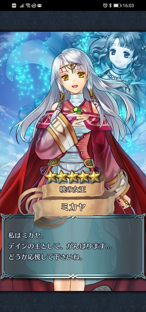 使ったオーブ15個目で、なんと次は、緑ピックアップのミカヤが出ました。1体のみを持っているので、これで1凸出来てスペックアップできます。オーブ15個で星5が2体なので、今夏のプルメリアガチャは序盤からかなり調子いいです。後は、プルメリアと伝承セリカが出てくれるとかなり嬉しいですが、このまま181個のオーブを使って爆死も考えられるのが、このFHEです。