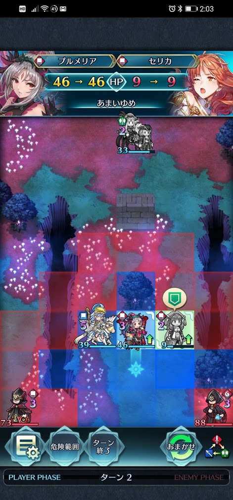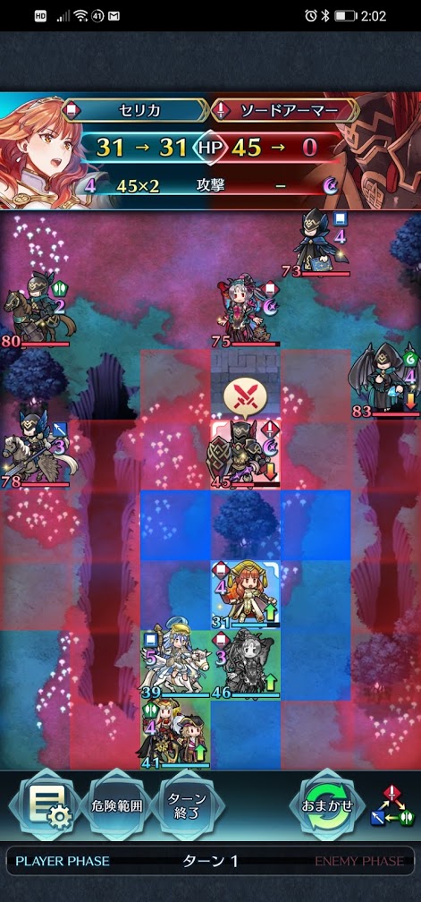早速、セリカで赤重装を攻撃します。一撃では倒せませんので、赤重装をセリカで攻撃後にプルメリアを使ってセリカを再稼働させます。プルメリアがセリカを再稼働させることにより、セリカ自身に速さ、攻撃バフも効いていますし、赤重装には速さ、魔防ダウンのデバフがかかっているので、普通に2回目の一撃で倒せます。プルメリアはぶっ壊れ性能で本当に強いです。