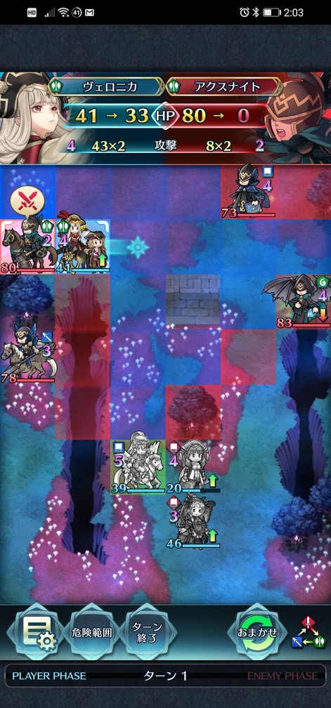 海賊ヴェロニカで敵のプルメリアを倒すと、疾風迅雷と剛剣3で再稼働出来ますので、次に左端にいる緑の斧騎馬を攻撃して倒します。一撃で倒せます。これで1ターン目が終了です。