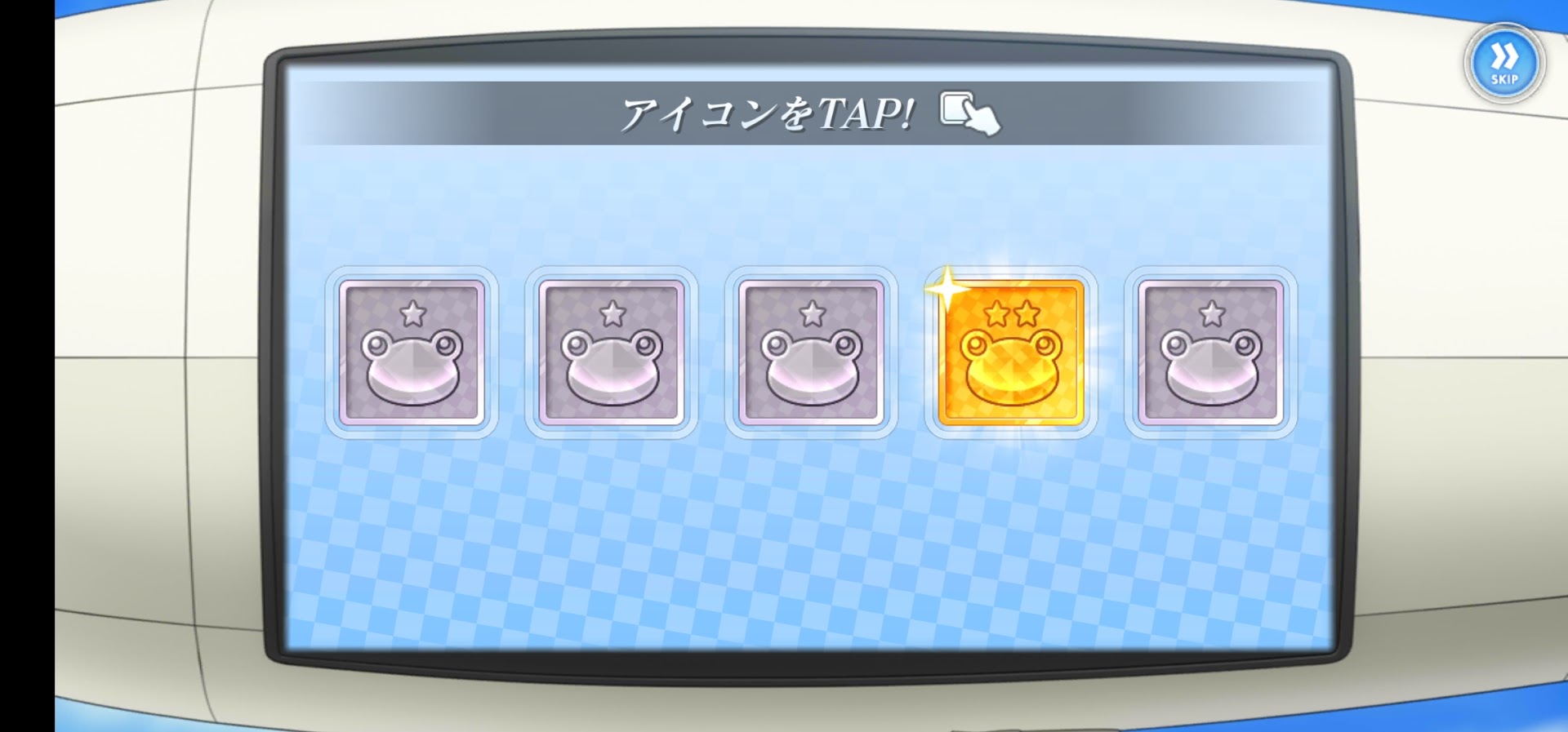 今回は、ステップアップガチャなので、最初のSTEP1の5連を回した結果は・・・、残念ながら星3の確定演出も、ゲコ太をタップした際のビリビリ昇進演出もなくハズレでした。