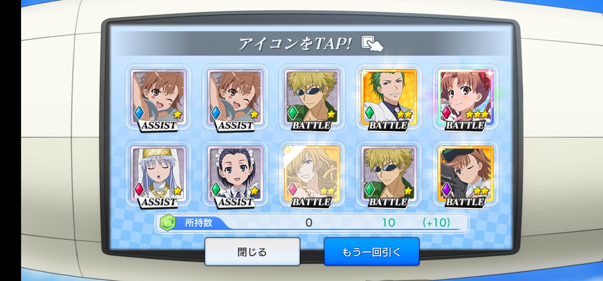 とあるIFって、このすばのコラボイベントの時にインストールして、やり始めたんですが、その際にゲコ太石が0になりすっからかんになっていたんですけど、結構なゲコ太石を配布してくれているようで、いつの間にか40000個位溜まっていました。ゲコ太にも余裕はありますから、早速、10連分を回していきます。エステルは持っていませんし、可愛いので出るといいなー。