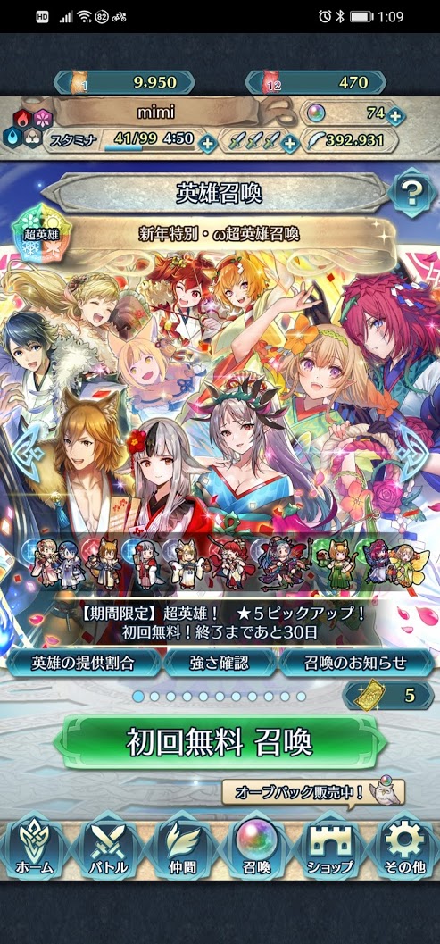 新年早々から、ファイアーエムブレムヒーローズでは、新しい「新年特別・ω超英雄召喚」が開催されていました。今年はコロナで初詣以外は外に出れないので、部屋の中ではやることも少ないですから、スマホをいじっている人って相当多そうです。なので、ソシャゲの売上も相当高くなるのでは?と思いつつも、溜まっていた74個のオーブを使って全力で回していきます。