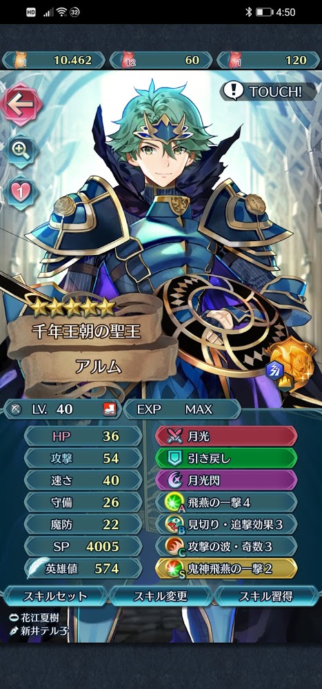 普段、全然使わないけど、火力担当で伝承アルムです。ドノーマルですが、聖印に鬼神飛燕の一撃2を装備しています。