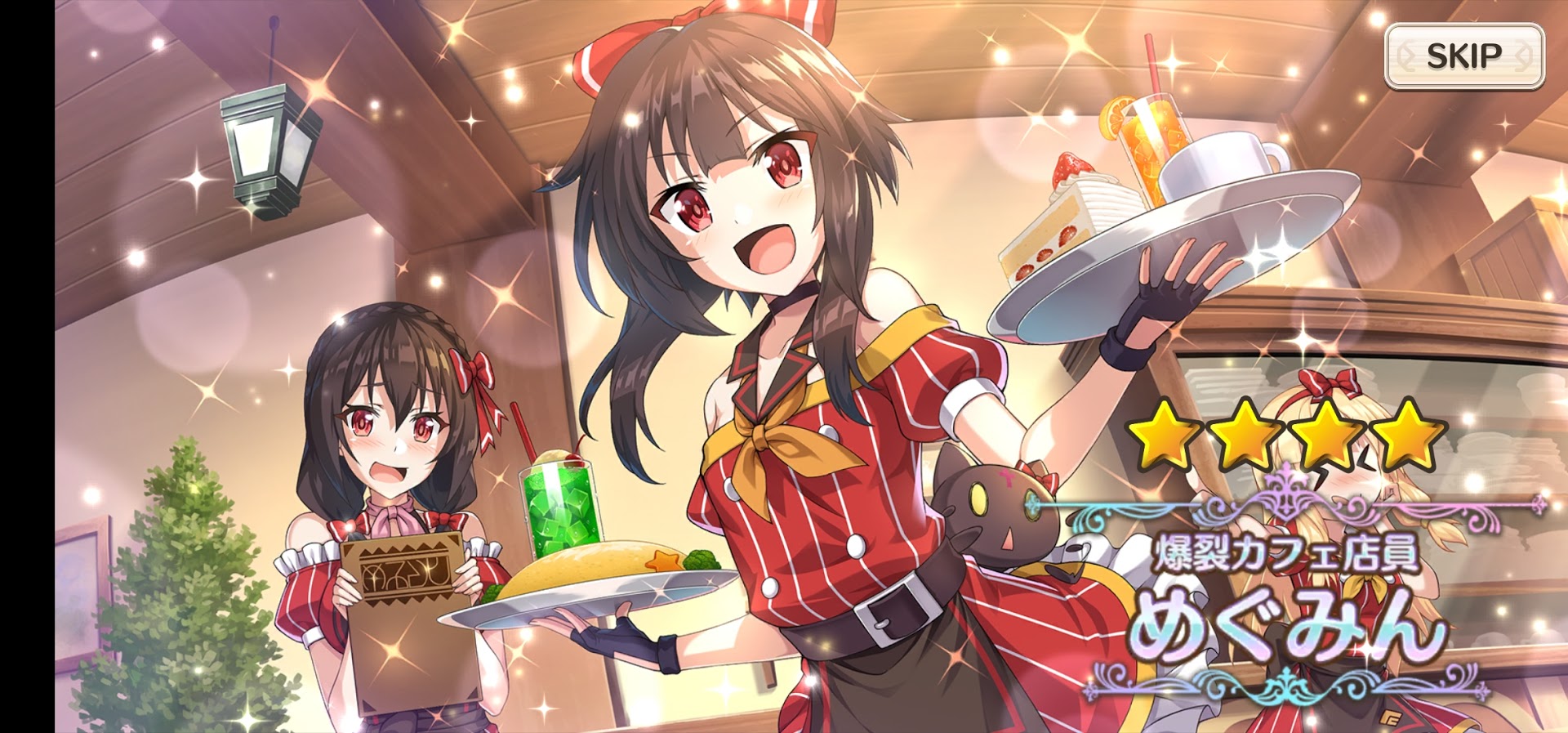 いきなりのふくびき券で出たのは、★4カフェ店員めぐみんです。カフェ店員めぐみんは緑属性なので、緑属性のめぐみんでもっていなかったこともあり、これは嬉しいです。ちなみに、めぐみんは試練のレベルも最大にしていて、専用武器もレベル最大にしてますから即戦力で使えます。ただ、リリース当初からめぐみんの爆裂魔法が弱すぎるので、もう少し改善して欲しいです。