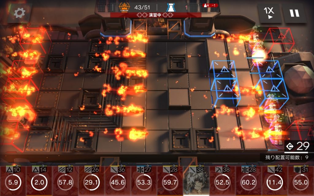 編成は8章すべてのステージをクリアしてきた適当な編成ですが、序盤は問題なくすすめることが出来ますし、ボスが出てきても最後に配置した2体に遠隔の術攻撃をして、しばらくするとその術攻撃されたキャラが周辺を巻き込んで爆発をするのもわかります。なので、キャラを2体並べておいてしまうと爆発が誘爆してしまうのでそういった配置をしてはいけないのもわかります。