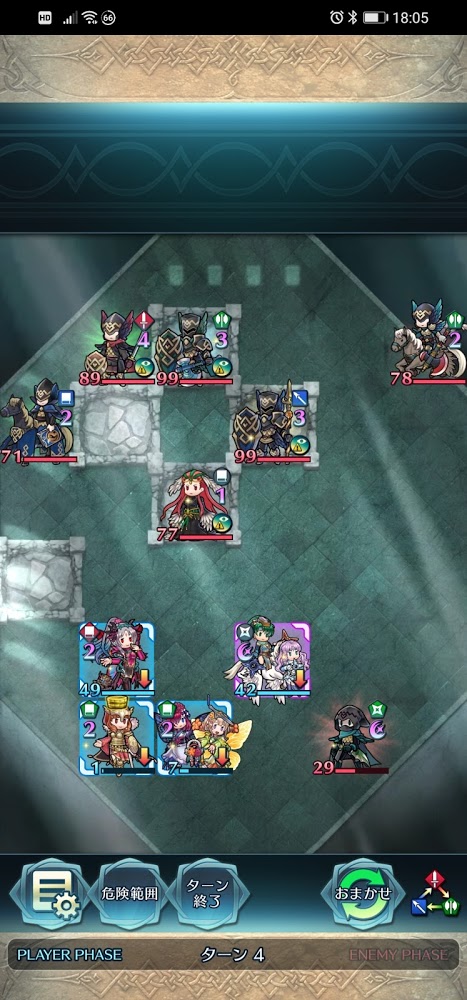 4ターン目の初期配置は以下のとおりです。※アスタルテの周辺の敵のアイコンを見ると、魔防バフやパニック等がついているのが確認できますね。この状態の敵は魔防が大幅にアップしているので、スキルがフル発動している伝承セリカですら、1回の攻撃では倒すことができなくなります。アスタルテは使い方次第では相当強いのかもしれませんね。
