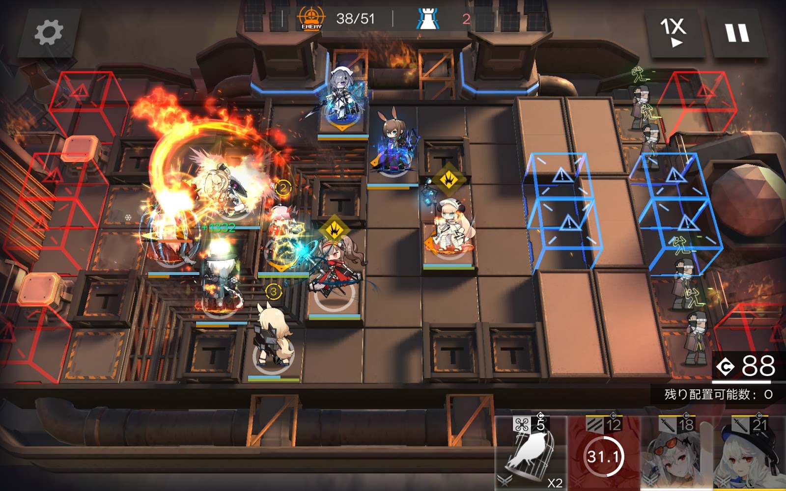 ブレミシャインのスキル3を発動、シルバーアッシュのスキル3を発動、更にアーミアのスキル1を発動して攻撃防御バフも発動します。ここで更にスカジを配置してボスをタコ殴りにするのですが、ブレミシャインの攻撃回復でなんと毎回1332もHPが回復しています。スカジとブレミシャインの組み合わせもかなり良さそうです。ボスを下のルートを通過させずに倒せるのか?