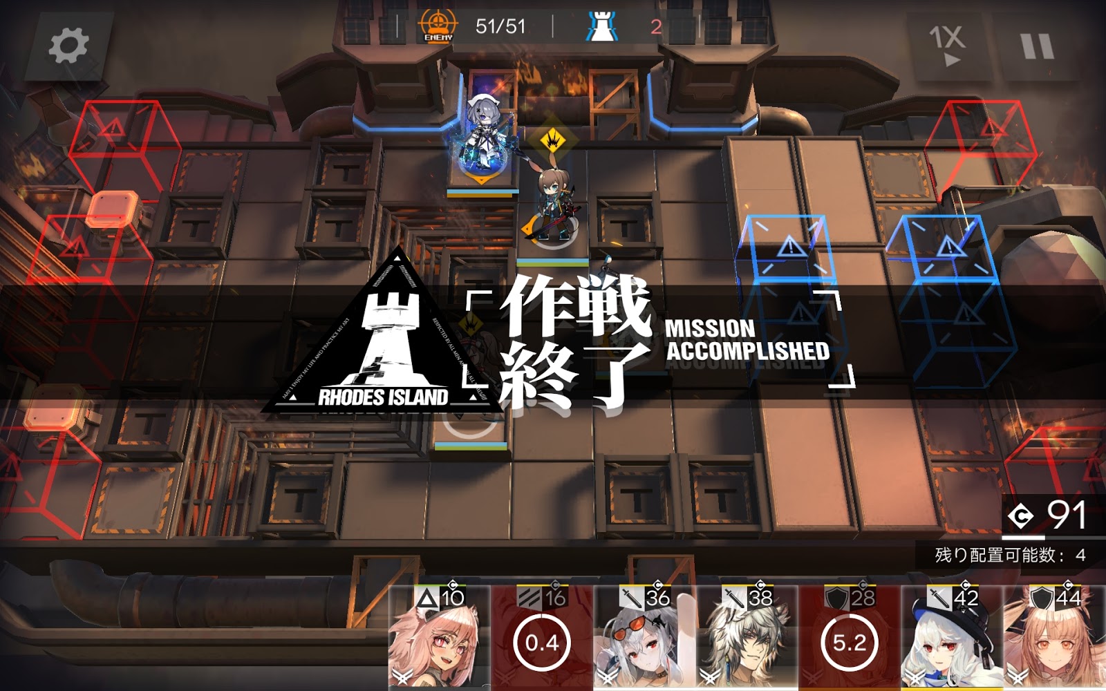 回復するコストの数字を見てみると、ボスを倒してから50秒ほど何もない状態が続いていました。まあ、無事にクリアできました。耐久が2になっていますが、最初から2だったような気がするので、このまま結果を見ていきます。多分、火の玉の爆発でも村人は1人も倒されていないと思うんですが・・・。アークナイツの通常ステージの耐久は3になっていることが多いですからね。