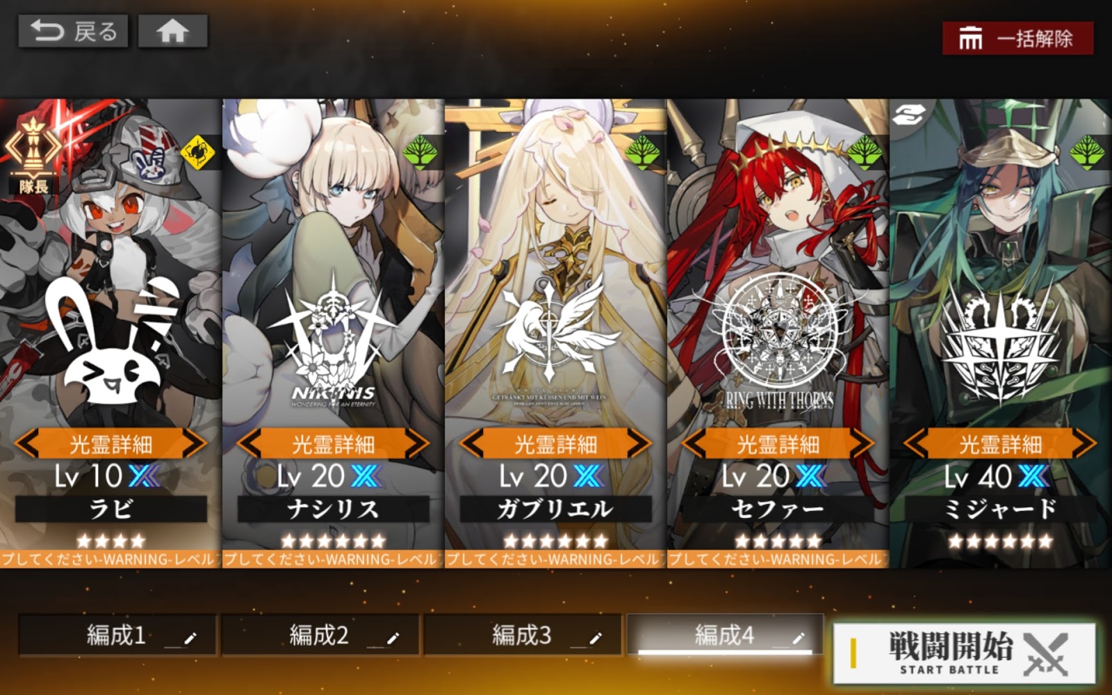 とりあえず、火力担当のミジャードだけは覚醒2のレベル40にして適正レベルにして、その他は育成が面倒なので、覚醒2のレベル20にしてます。体調のラビってドリルを持ったキャラに関しては、覚醒1のレベル10なので、全然火力が足りていませんが、クリアするだけならこの編成でも普通にクリアできます。ただし、火力不足で★3クリアは出来ないのでクリアのみですね。