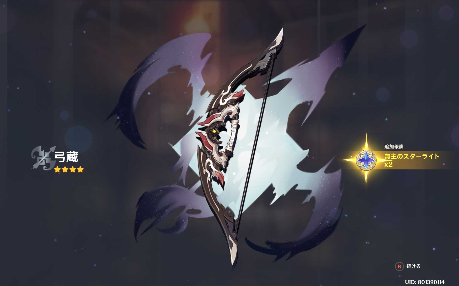 70連目で弓蔵って弓も雷電将軍と同時に引けました。この弓の性能を見た感じ、通常攻撃特化の弓なので宵宮に合いそうです。宵宮はこれまでは★3のリカーブボウを使っていましたから、これで大幅な火力アップが出来ると思います。10ヶ月ぶりの復帰なので、本当に装備も無いし、武器も無いんですよね。原神って強い装備はガチャしか無いっぽいですし・・・。困りました。