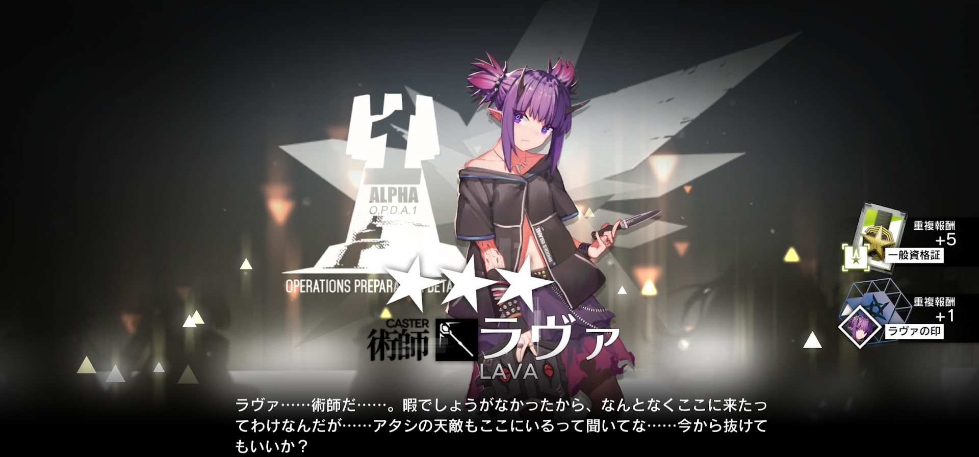 なんと!★5確定演出から出てきたのは、すり抜けのキアーべでした。これは予想外ですね。まさかのすり抜けです。ただ、キアーべは持っていなかったので、カフカが出ないのは残念でしたが、キアーべでも普通に当たりです。キアーべって術デバフをもっているテキサスタイプの前衛で、ロボットの高速再配置スキルも持っているので、特定のステージで使えそうですね。