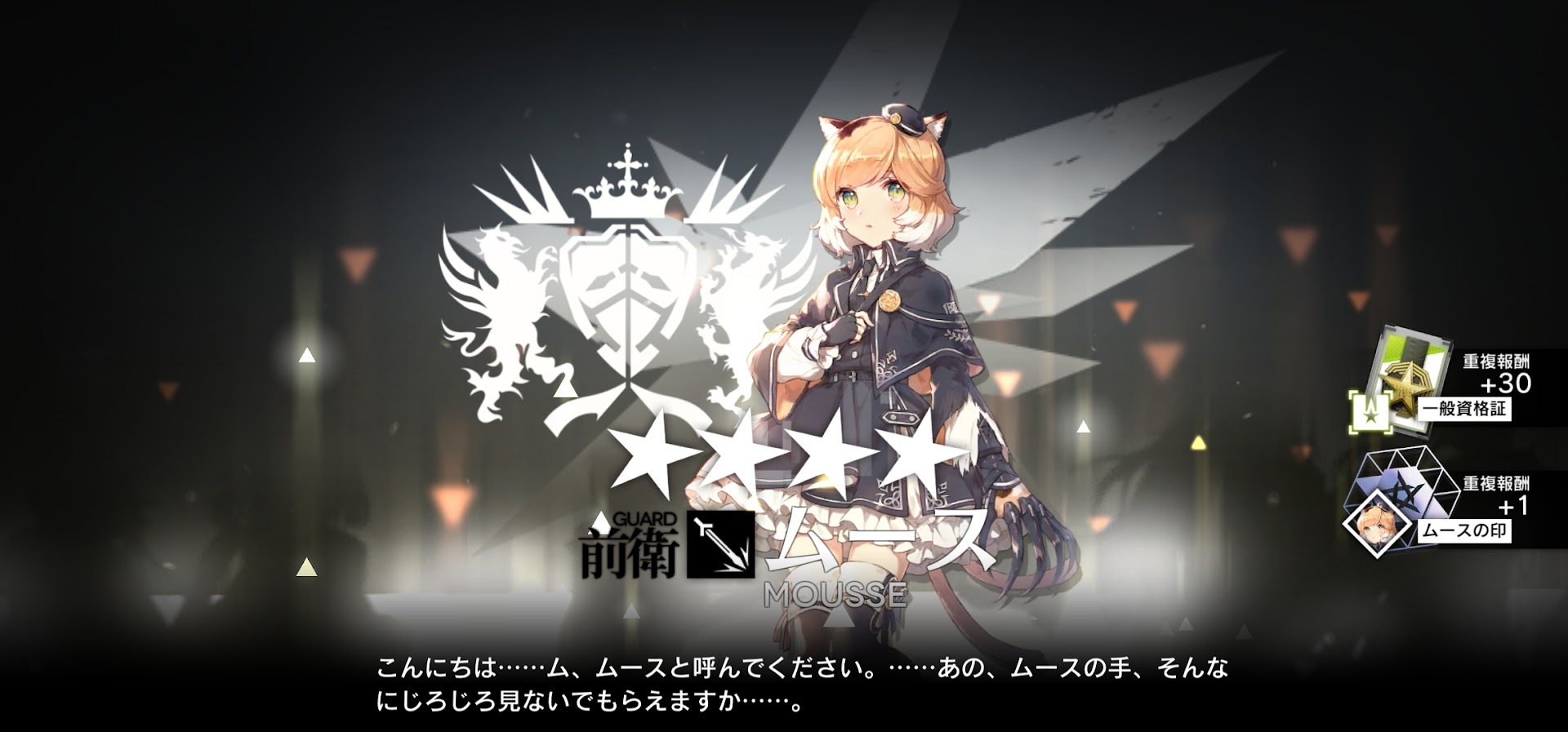 早速、単発で回していきます。初回は紫演出でした。出てきのはムース。流石に初回単発で★6キャラは無理でしたね。