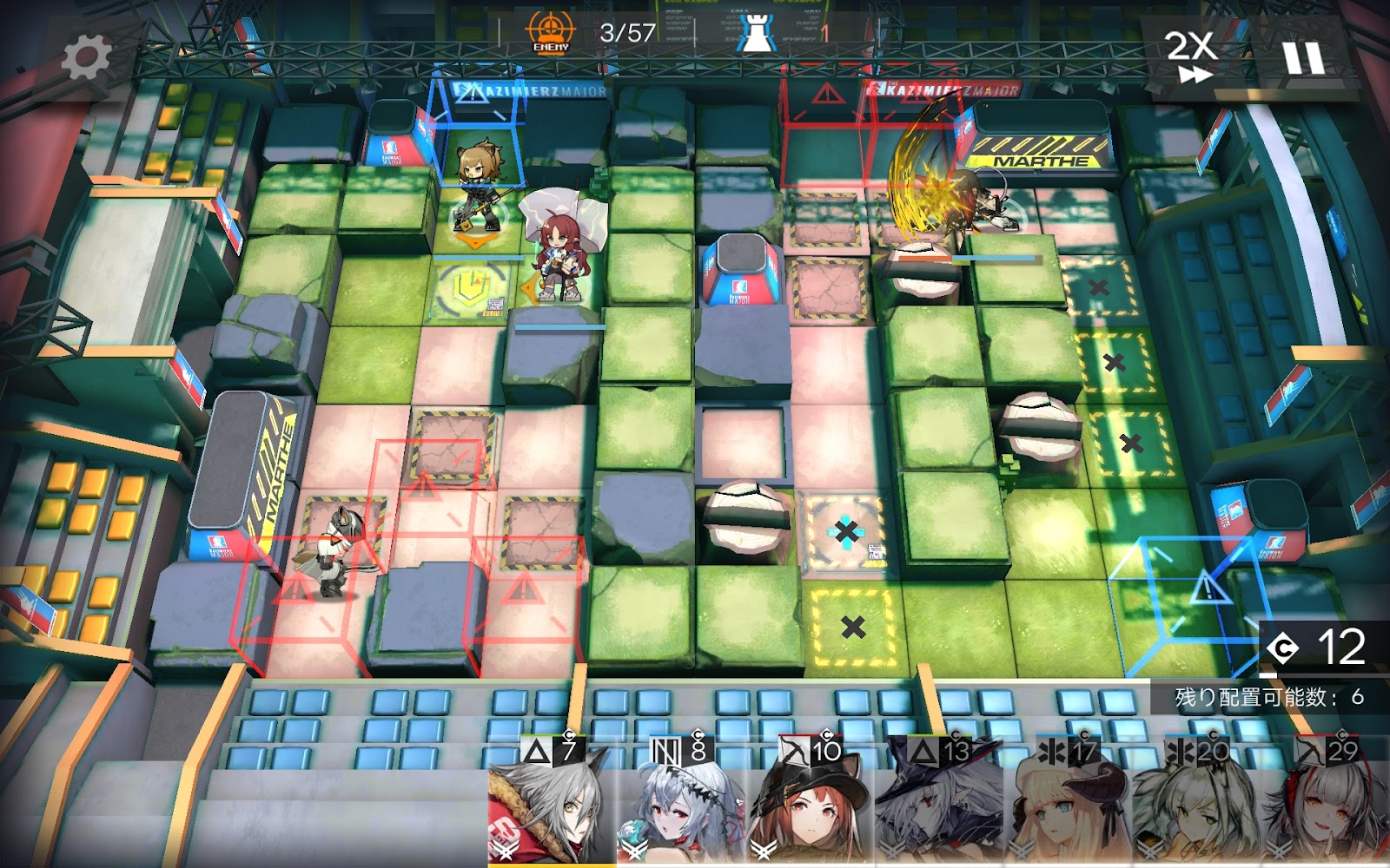 右側にグレイディーアを配置してスカジに攻撃力アップ効果を発動。左側の盾マークの床にケルシーのモンスターを配置すれば、18等級の常設ステージはほぼ完了状態です。