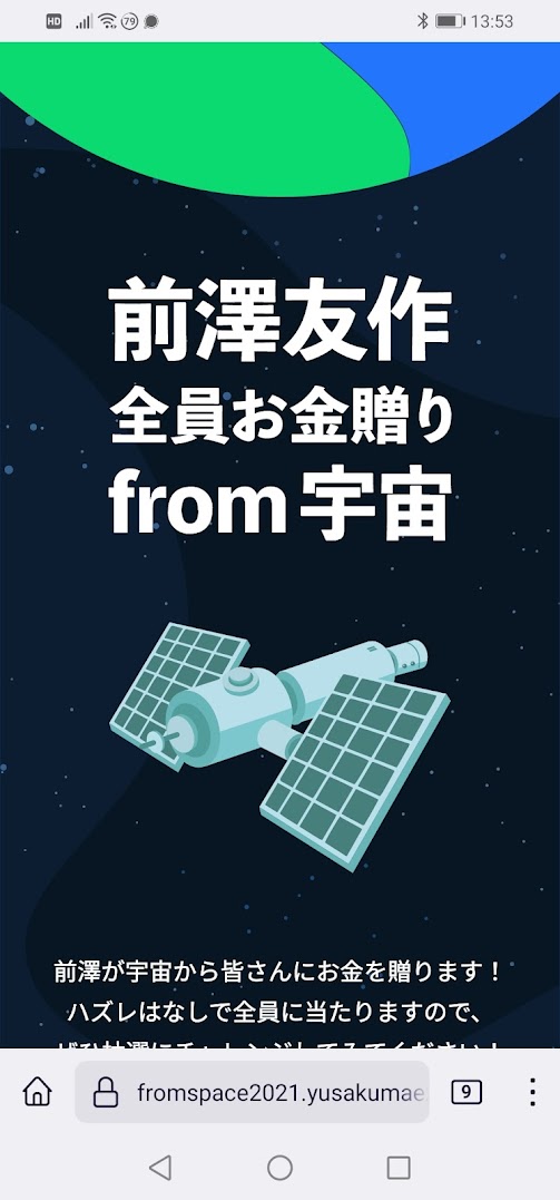ネットのニュースを見ていたら、前澤友作さんって人が、日本人で初の?宇宙旅行をしているらしく、宇宙から沢山の人に100万円をプレゼントするって企画を行っているのを知りました。あまりに胡散臭い話なのでちょっと興味を持って確認をすると、なんでもLINEのアカウントが無いと応募資格すらないらしい。ラインは朝鮮系なので私も友人も絶対に使わないんですよね。