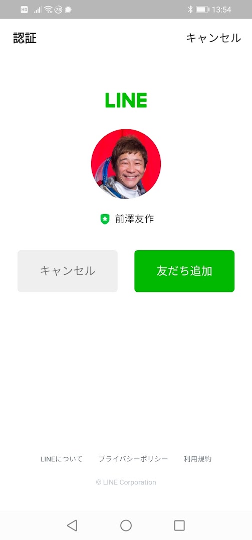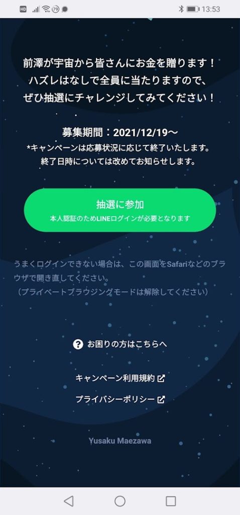 LINEの友達として前澤友作さんを許可しないとダメみたい。これは、相当な宣伝になる筈です。許可するにしないと先に進めない仕様のようです。