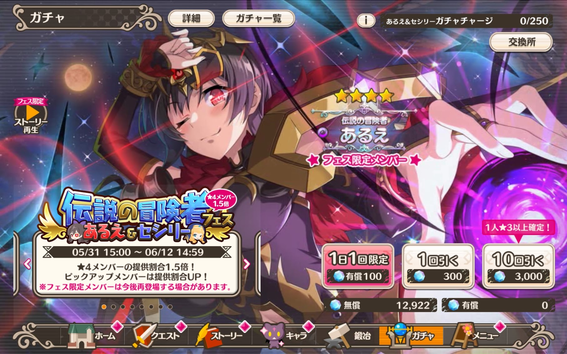 うーん。50連目もダメでした。結局、50連回して出たのはセシリーだけです。・・・とはいえ、普通にセシリーが出ただけでも大当たりなので、今回はあるえは諦めましょうかね。このファンってかなりの石を配布しているので、普通に100連くらいは回せる状態までは直ぐに溜まります。ただし、ゲーム部分があまりにクソゲーで、わきみちイベント?は完全に放置してる状態。