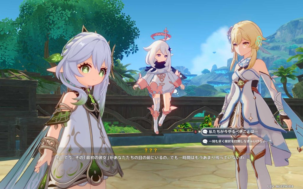 スメールの魔神任務の終盤になると、なんか?似たような会話が連続して発生するようになり、なにこれ?って思っていたら、謎のキャラが出てくるんですよね。これ、原神の公式で発表されていたスメールの草神ですね。最初は???って名称になっているんですけど、声質とか喋り方がシュタインズ・ゲートの鈴羽と全く同じで、この時点で、ああ、こういう事って思います。