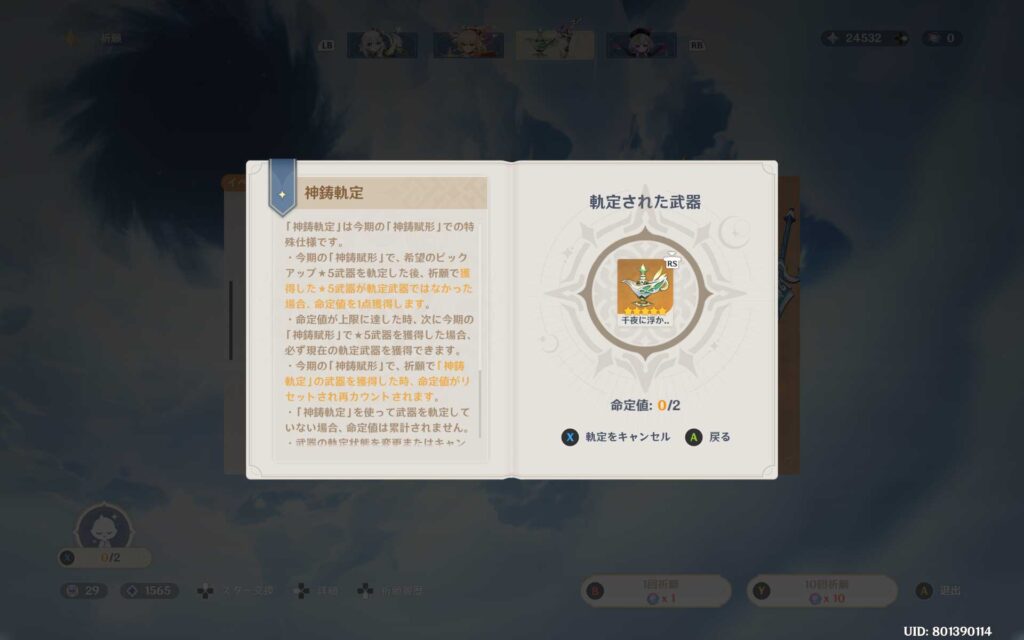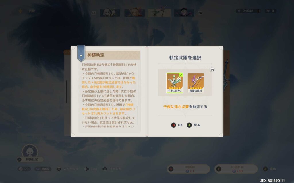 天井まで回す余裕はありませんけど、念の為「千夜に浮かぶ夢」をチェックしたのを確認して、早速、武器ガチャを回していきます。