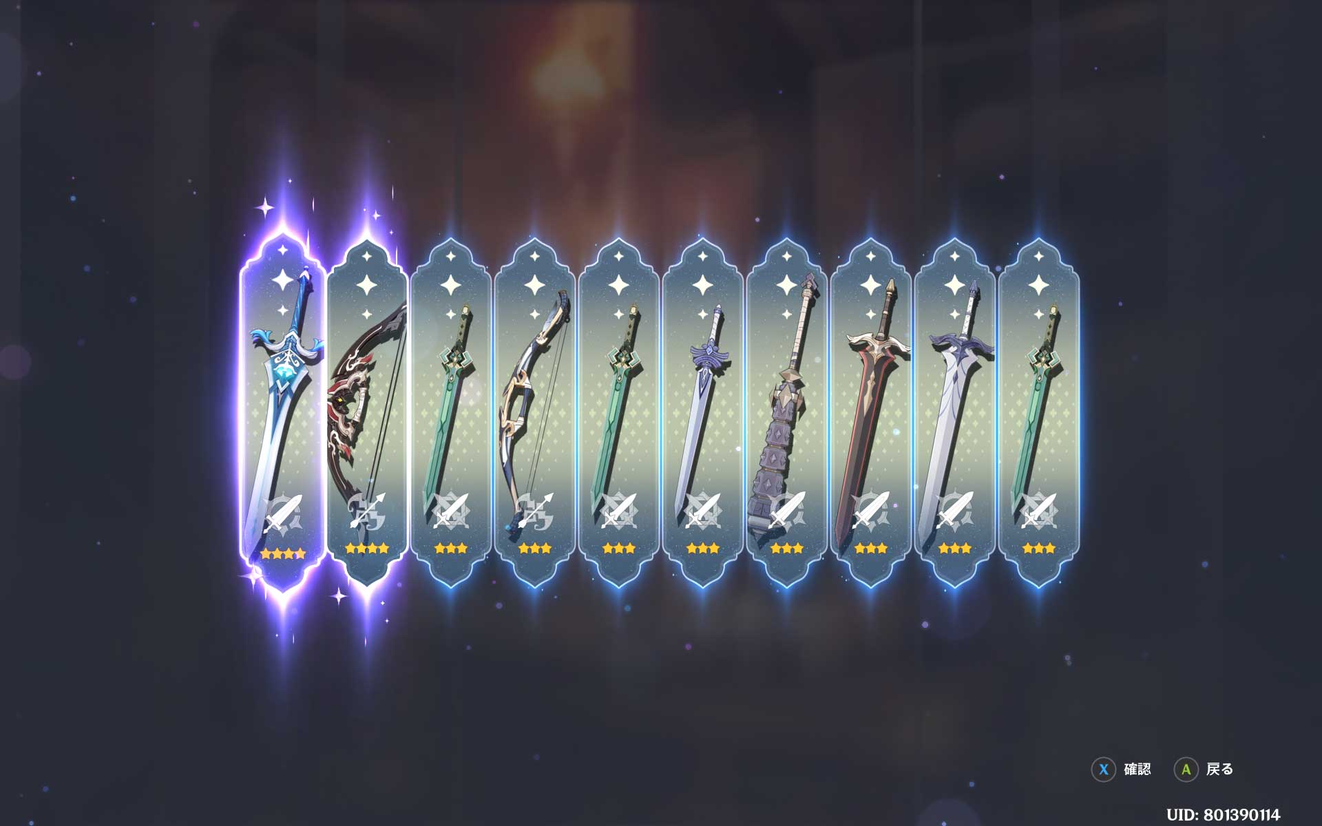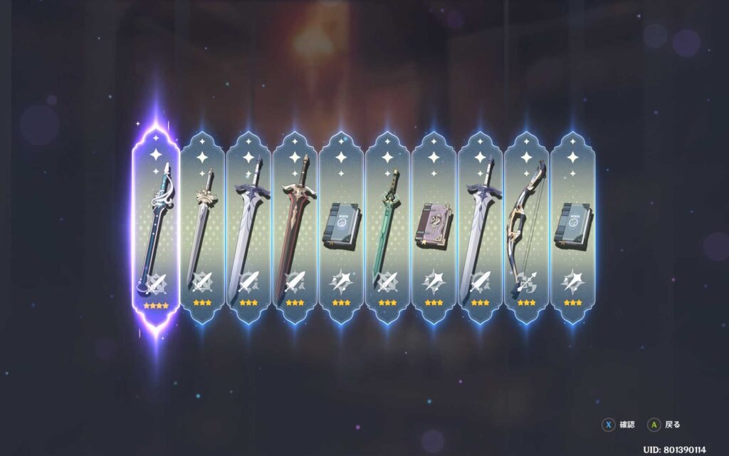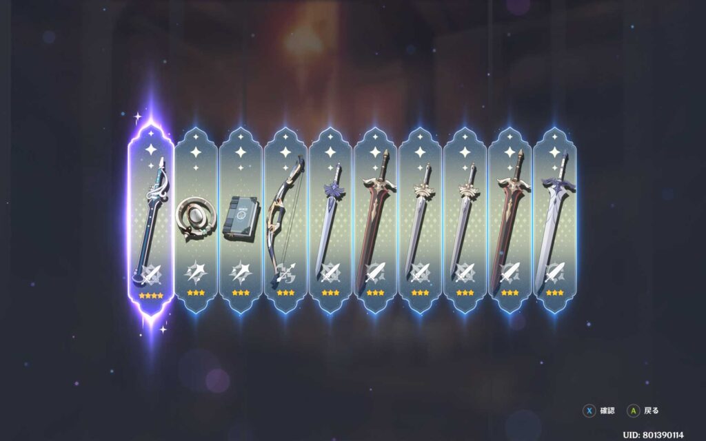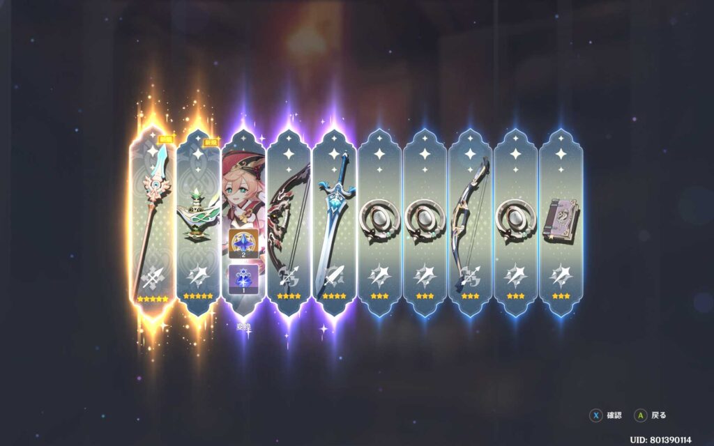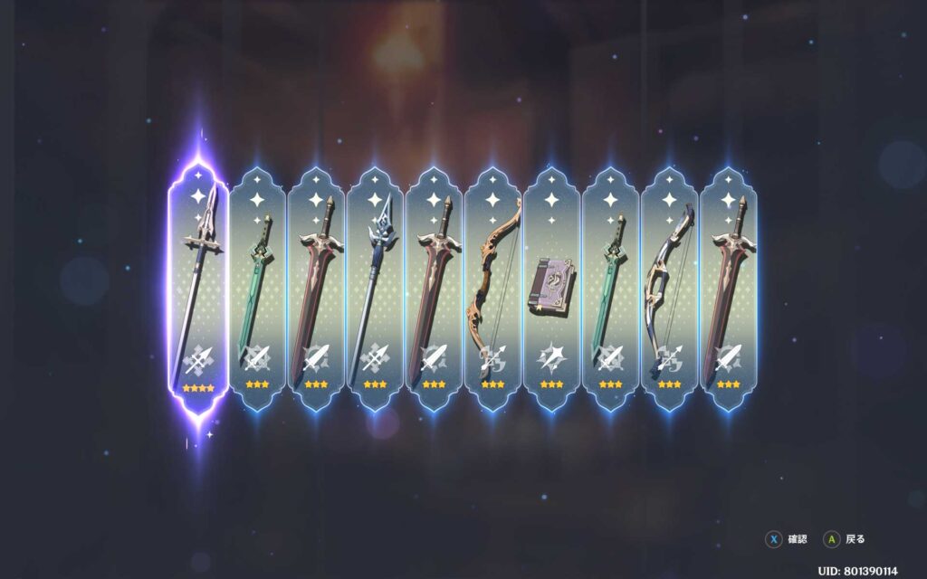 70連目で遂に星5確定演出が出てきました。キャラガチャと同じく、天井の10連手前です。これで、ナヒーダのモチーフ武器が出てきたら撤退できるので期待してます。