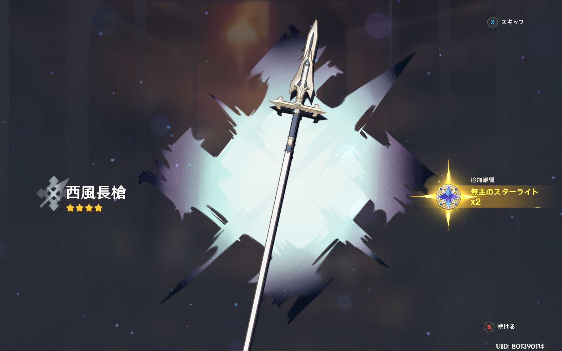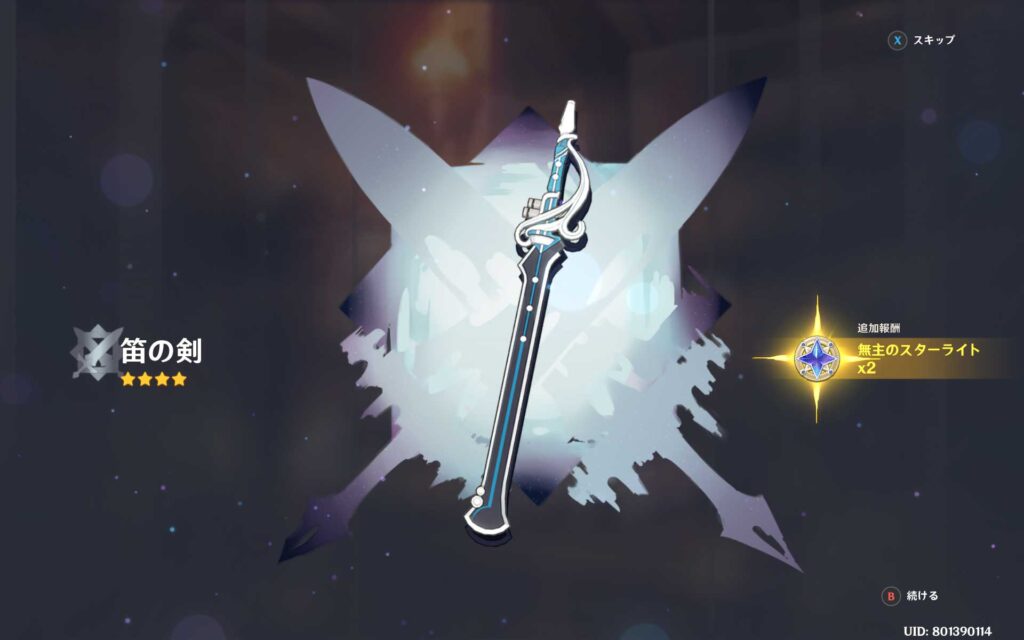 出てきたのは西風槍でした。これはまだ完凸できていないので、当たりです。出てきたのが笛の剣でなくてほっといています。