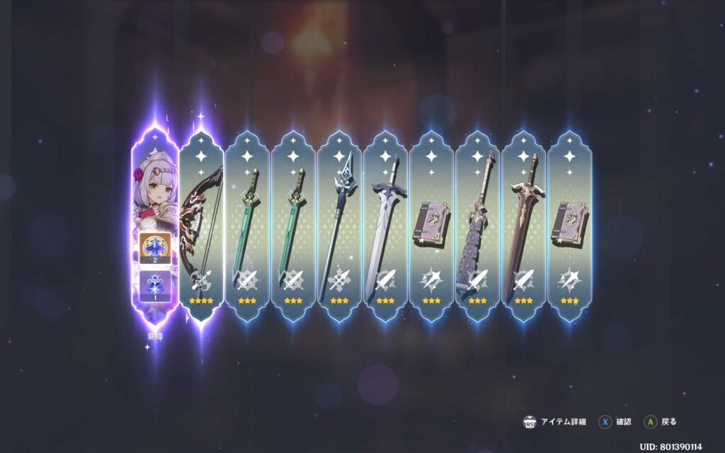 ナヒーダのキャラガチャではノエルが2体出てきて5凸になっていた訳ですが、追加の武器ガチャも1体出てきたので、ノエルは完凸になりました。ノエルは全く使ってません。