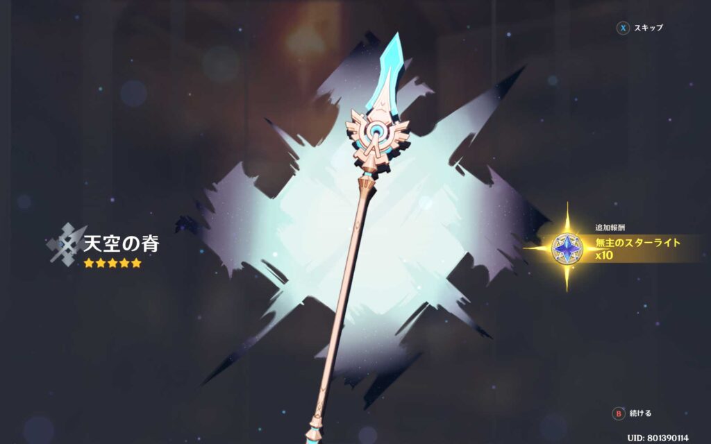 星5武器が来た!と思ってみたら、なんと!天空の脊って武器が出てきたんですけど・・・。これってまさかの常設武器のすり抜け?、よく分かりませんけど、ナヒーダのモチーフ武器ではなく、宵宮のモチーフ武器でもないので、普通にすり抜けたってことですかね?、いやー、ふざけるなよー。なんだよこれ!、武器ガチャって常設武器がすり抜ける仕様なの?やる気無くした。