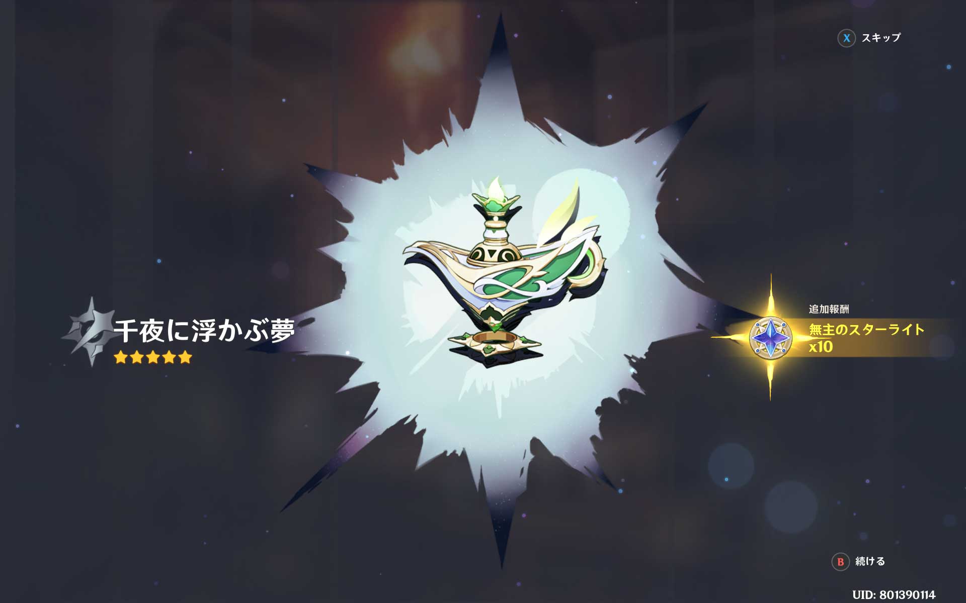 完全に諦めてボタンを連打していたら、???ってなりました。ええ?、これってまさかのナヒーダのモチーフ武器?「千夜に浮かぶ夢」では?、天空の脊は一体なんだったの?、もしかして、70連目で星5武器が2個同時に出たってことですよね?、これは・・・。天空の脊がでた後に、弓蔵が出てきて、「千夜に浮かぶ夢」も出てきたので、一気にやる気が出てきました。