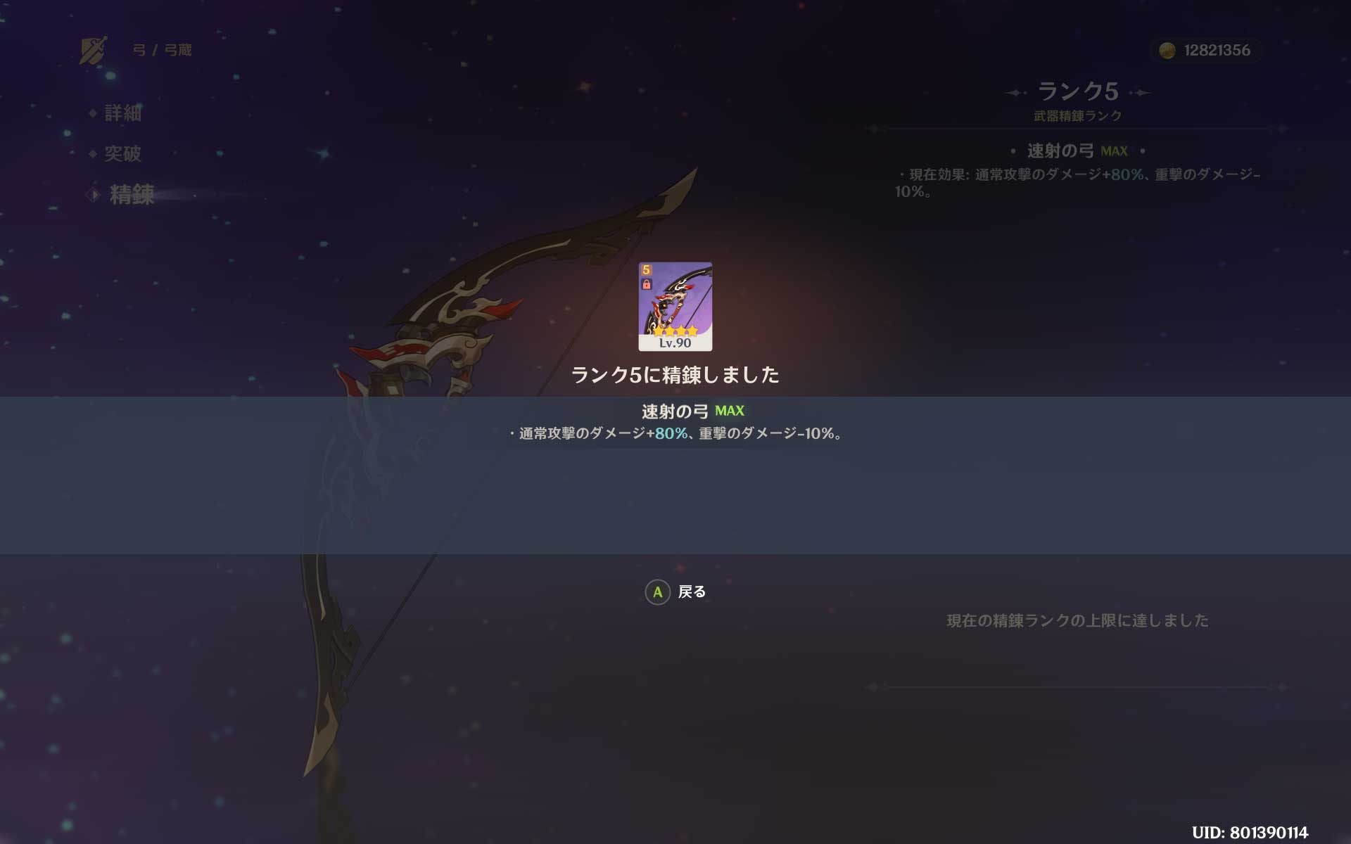 弓蔵が精錬ランク5になりこれで完凸です。通常攻撃のダメージバフが80%になりました。これで宵宮が相当な強化されるハズ。「飛雷の鳴弦」どうしようかな?・・・。