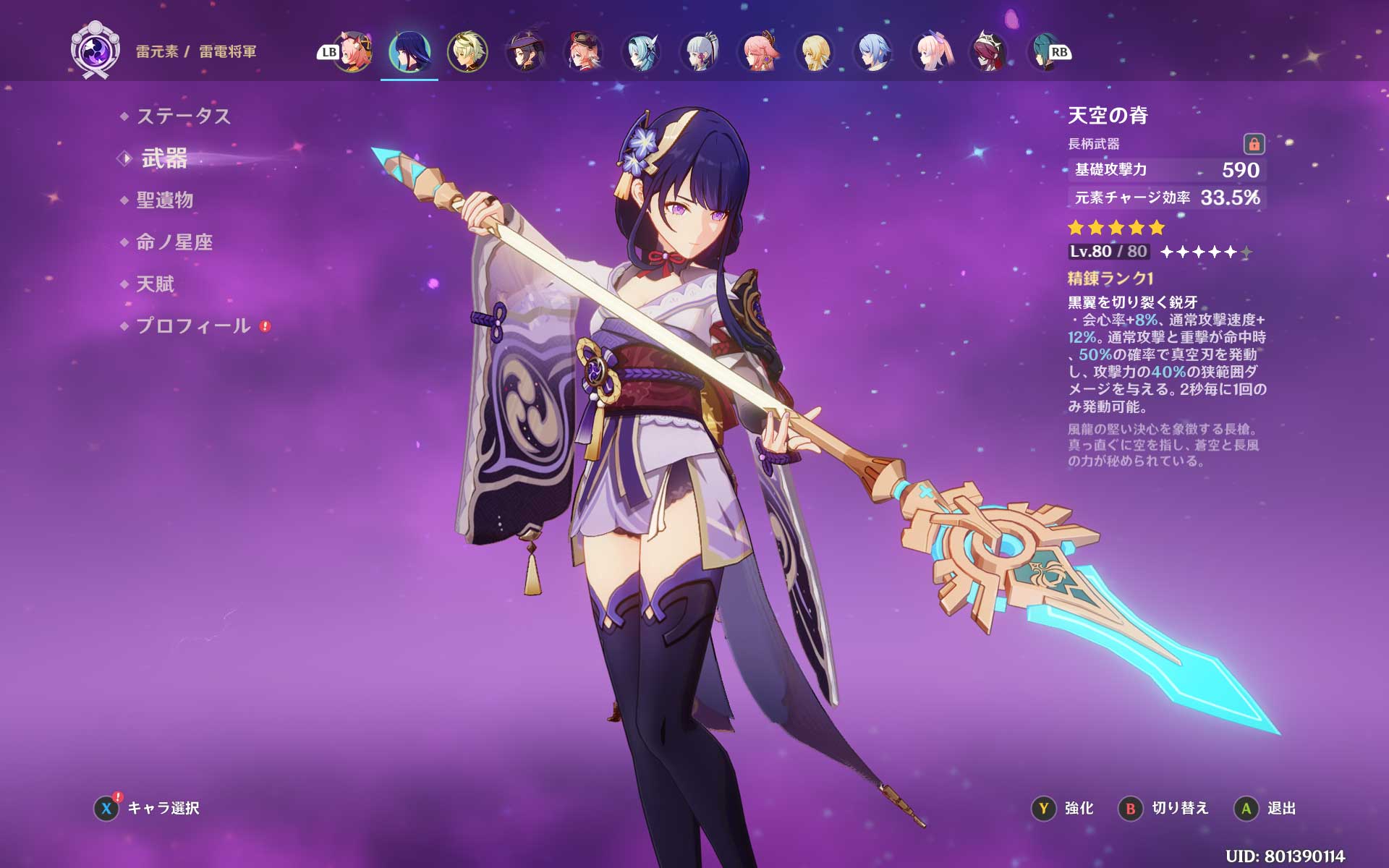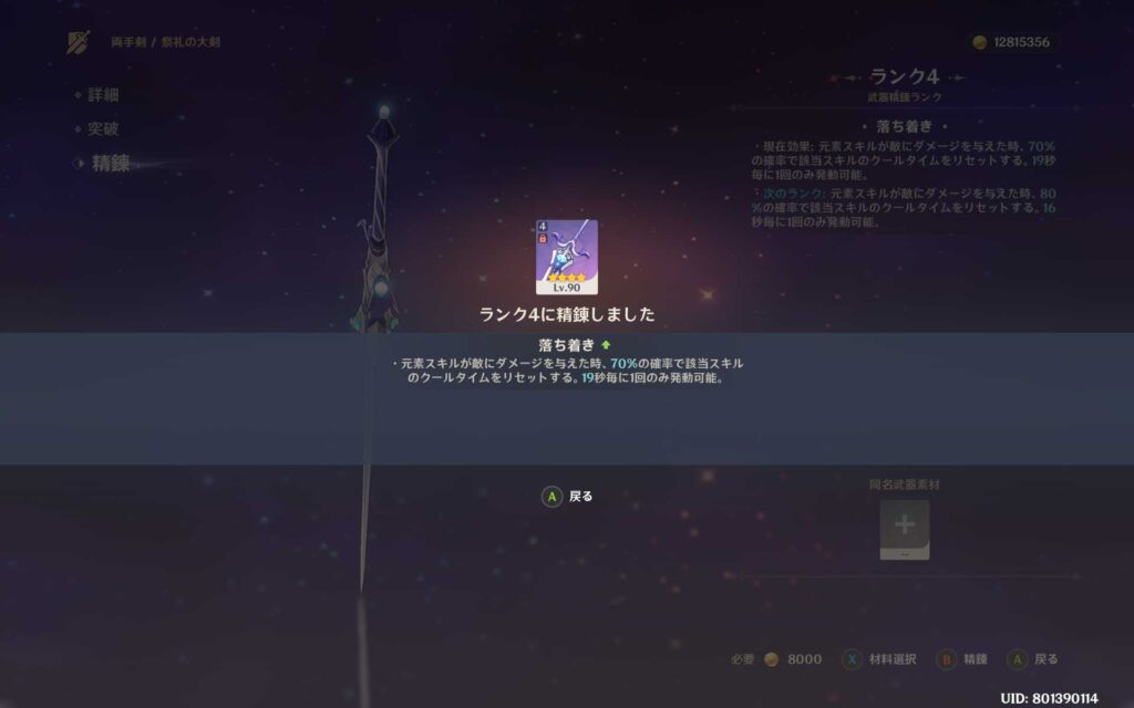 今回、70連目で引けた天空の脊ですが、強化素材の在庫が余っていたので、とりあえずLV80まで強化してみました。天空の脊って元素チャージ効率なんですね。基礎攻撃力も高そうですし、スキルも攻撃速度バフ?っぽいので、雷電将軍に装備させたら使えるのでは?と思いました。現在は、雷電将軍には護摩の杖を装備させています。天空の脊の方が使いやすいのかな?