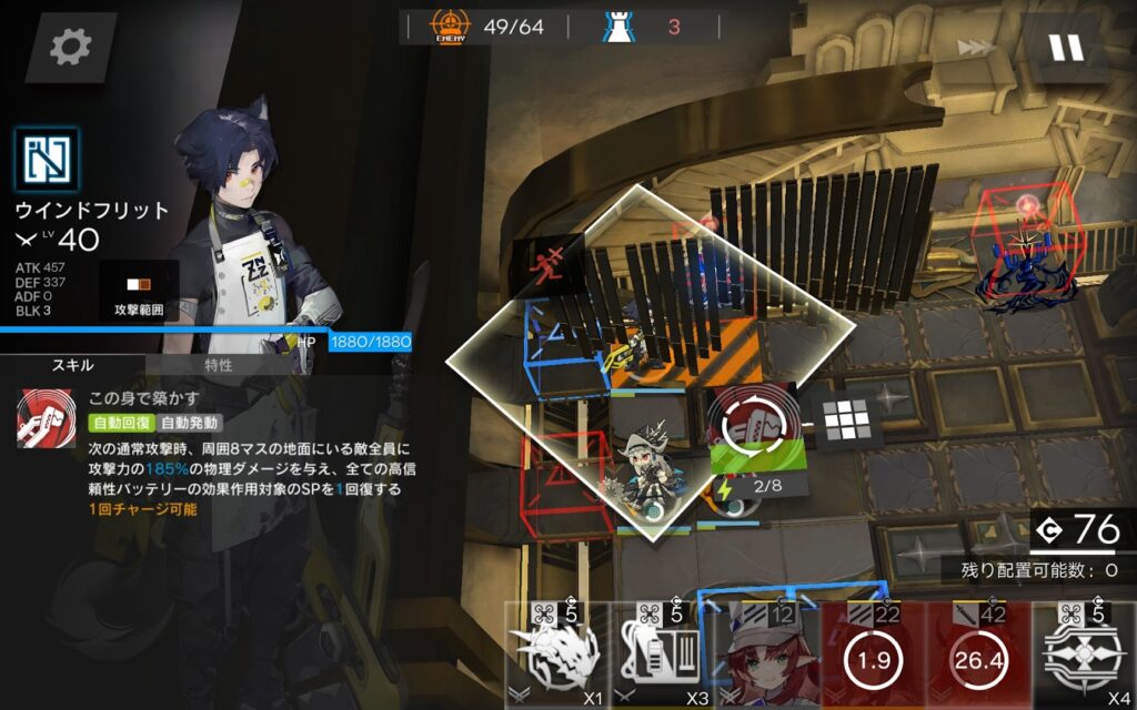 ウインドフリットが大好き!、絶対使ってやるぞ!ってドクターはふざけるな!って思っているかもしれませんけど、そこまでウインドフリットを使いたいのであれば、今後のイベントなどで積極的に使ってあげましょう。正直、中途半端で使えないバフキャラを編成するなら差し込み用のキャラ、もしくはテンニンカ等のコスト回収に特化した先鋒を編成した方が絶対に良いです。