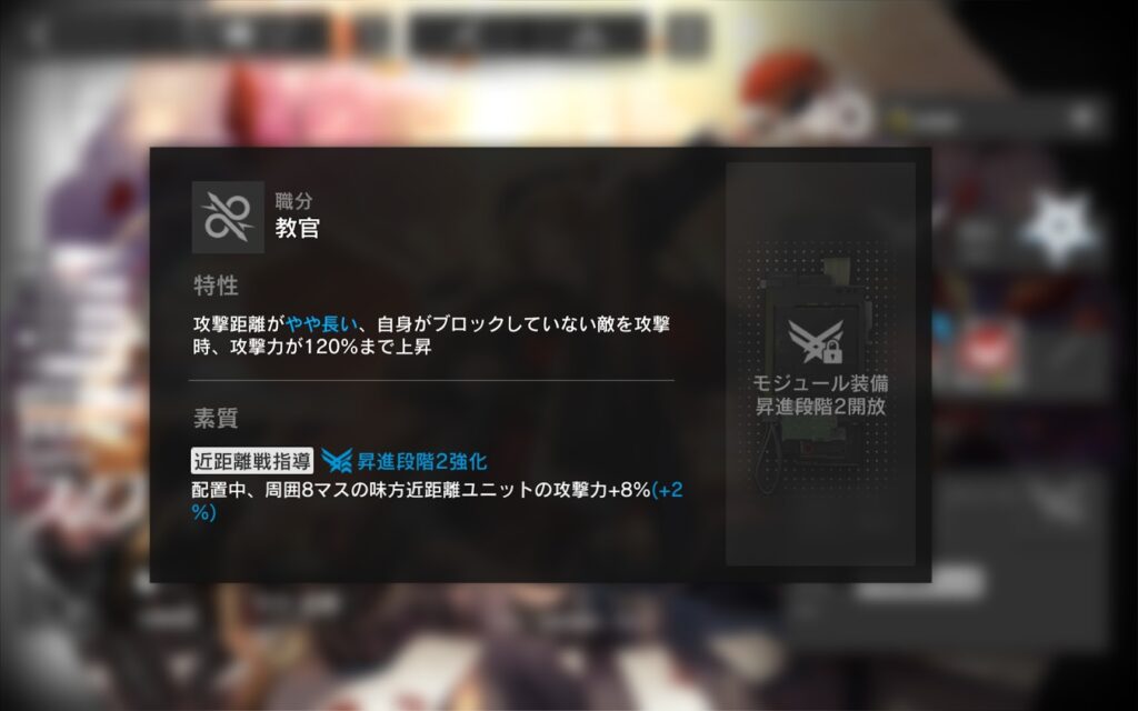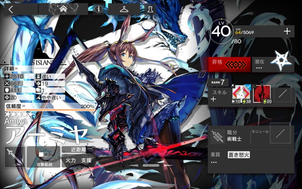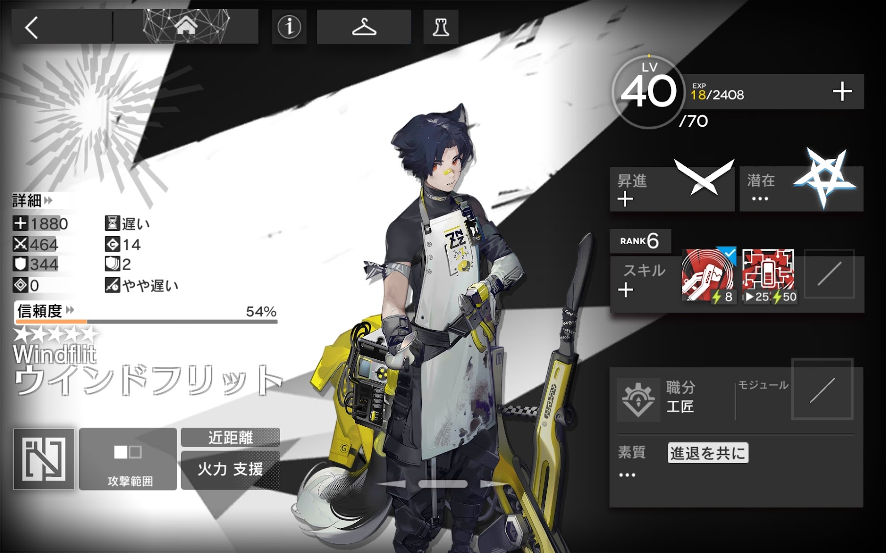 ウインドフリットに関しては、昇進2、LV40まで育成した場合、流石にこのキャラに使うのは育成素材と龍門弊がもったいなくて、これ以上は育成しないと思います。スキルレベルも6までは強化していますが、スペクターとアイリーニの強化、特化3に大量の育成素材をつかってしまった為、装置の在庫が全くありません。なので、スキルレベルも6で育成完了かな?