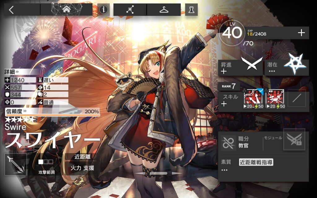 スワイヤーは遠距離攻撃ができて、攻撃バフ持ちのキャラです。見た目も可愛くて完凸していればコストも14と低い。しかし、スワイヤーをメインで使っているドクターを見たことが無いですし、私も昇進1のLV40までは育成しているものの、完凸していてもスワイヤーを昇進2まで育成しようとは思わないですからね。ウインドフリットと同様に前衛アーミアの方が圧倒的に強い。