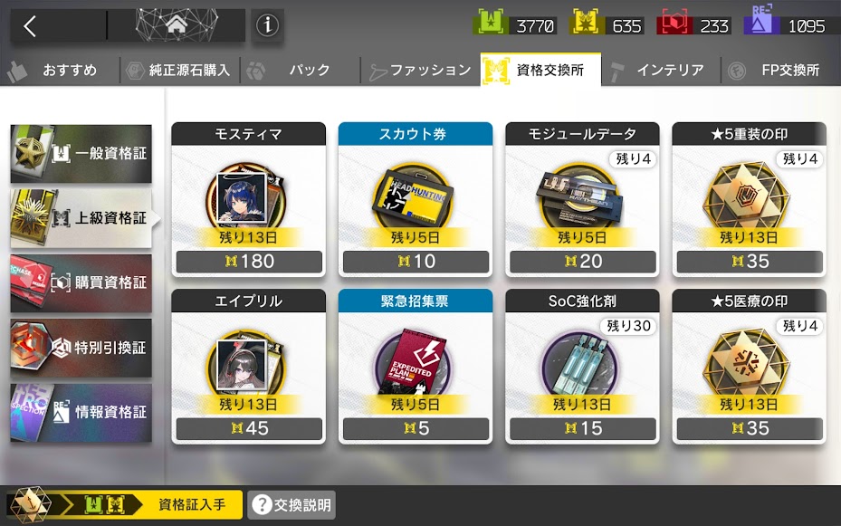 なので、今後、次の限定ガチャの為に、常設ガチャは引けなくなってしまっています。今回、星6のモスティマは必要ないんですけど、星5のエイプリルが交換対象だった場合、交換する価値が極めて高いキャラなので、交換しておきたい為、早速、上級資格証の交換対象を確認しました。リーが交換に並ぶのはも少し先になるでしょうかね。