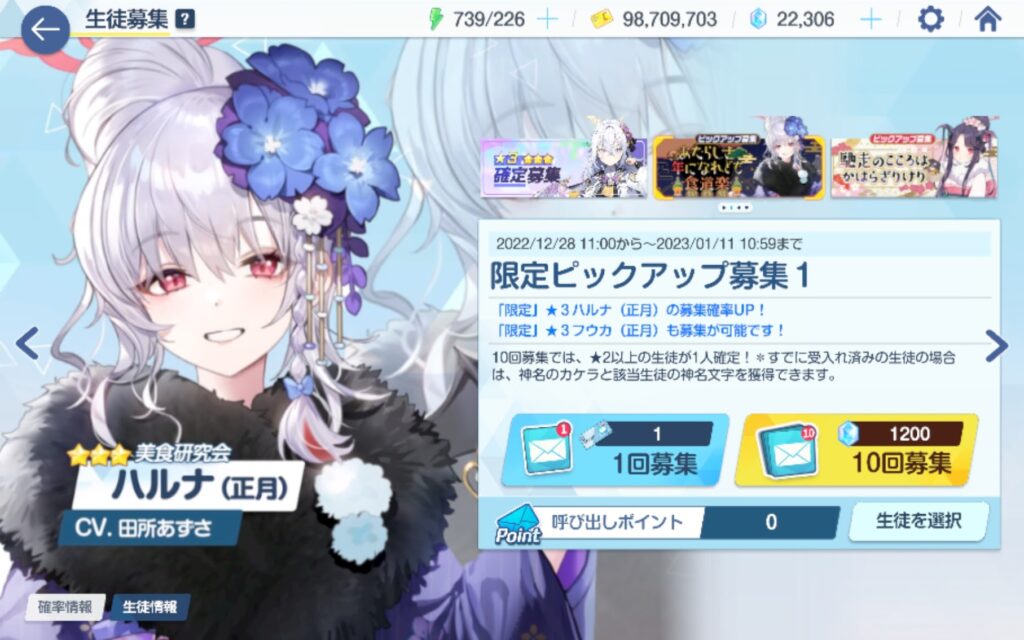 アップデートが終わって、ログインしてみると、正月のイベントが開催されていて、新キャラで多分限定だと思うんですが、ハルナの正月バージョンが実装されていました。性能は全くみていませんが、見た目が可愛いので、とりあえずはガチャを回してきます。天井までの24000個はありませんけど、ガチャが終了するまでに、天井分の石は確保できそうなので回していきます。