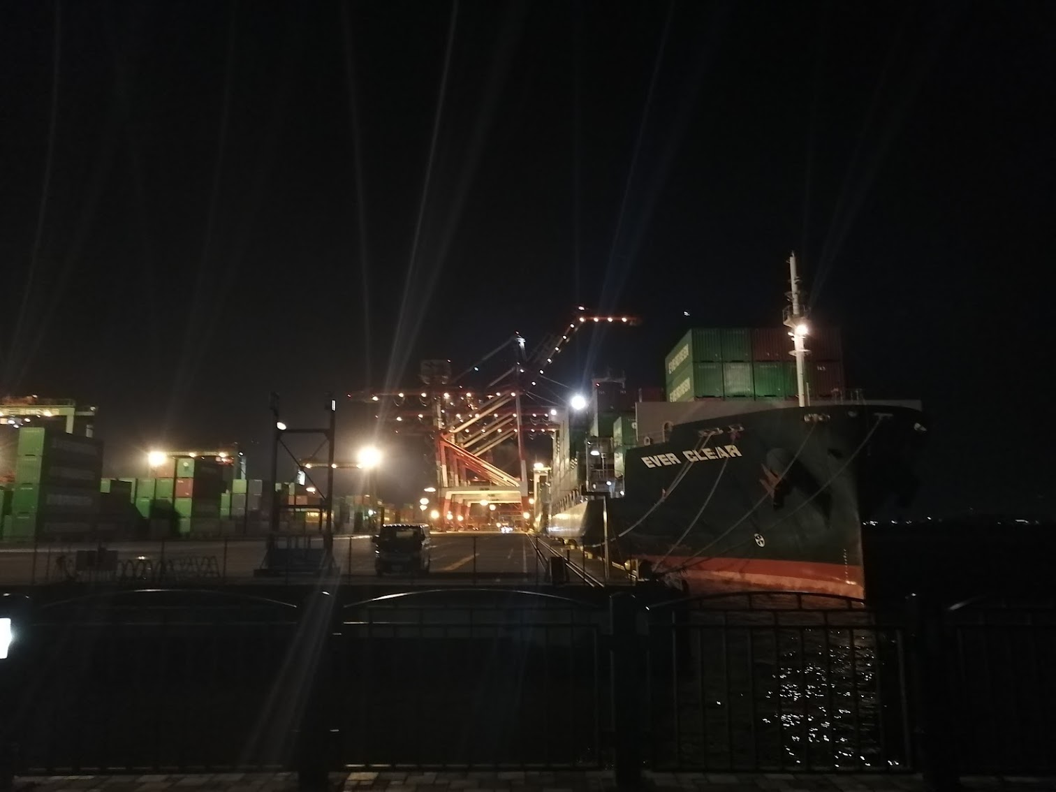 すぐ近くにあるコンテナ船がいつも係留しているクレーンの前が絶好の釣りポイントになっています。コンテナ船って大量の海水をバラストタンクに入れていて、係留中に海水を貯めたり、排出したりしているので、それで魚の餌とかプランクトンが沢山集まり、それを目当てにより大きな魚が集まってくるのかもしれませんが、ここも釣り禁止になってしまった感じですね。