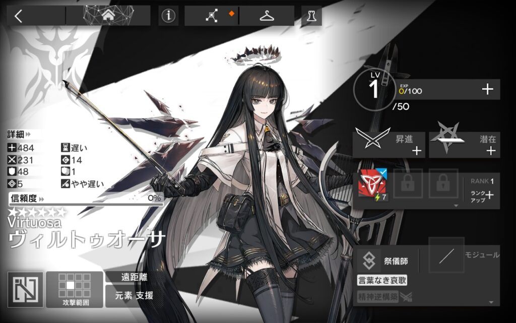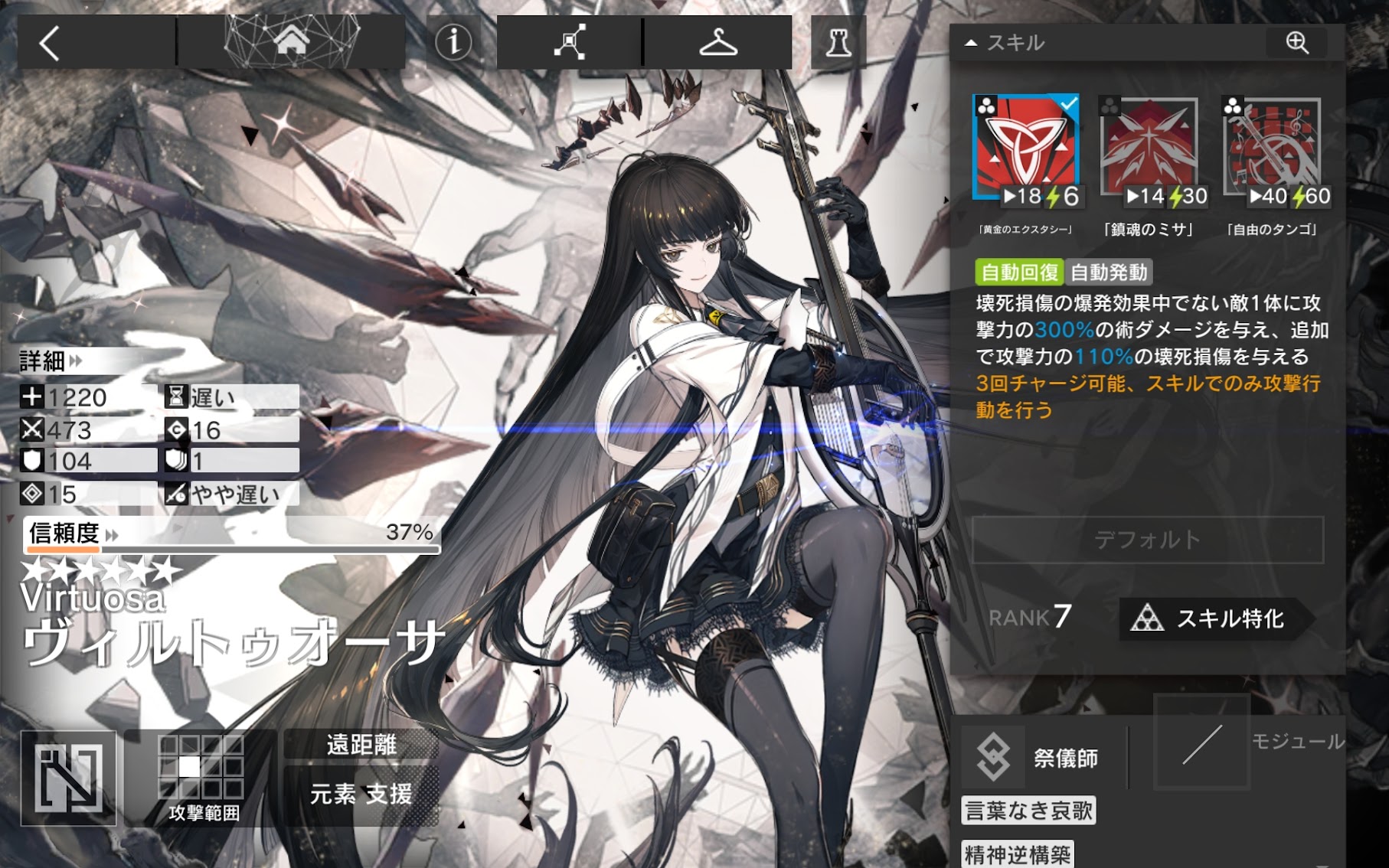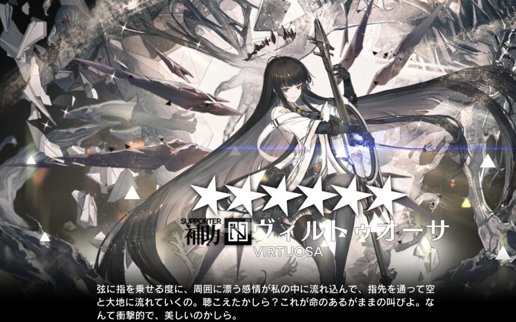 プレイアブルキャラクターとして実装されたら前衛になり、相当な弱体化がされてしまった印象です。ヴィルトゥオーサとは異なり、メインで使うことはなさそうです。こちらは常設キャラなので、イベント終了後には通常ガチャで引けるようになります。よって、無課金ドクターの場合、ヴィルトゥオーサが引けたら撤退したほうが良いかもしれません。