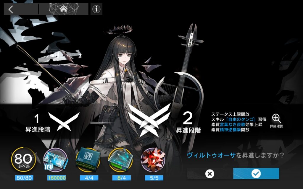 何でも、セールスランキング1位になったとのことで、運営から10連分のガチャチケットが配布されて、それで追加で10連を回した結果、ヴィルトゥオーサがやっと出てくれました。もはや、ガチャチケットも合成玉も無く、このまま爆死するのかと思ってましたからね。まあ、とりあえず引けてよかった訳で、早速、ヴィルトゥオーサを育成していくことにしました。