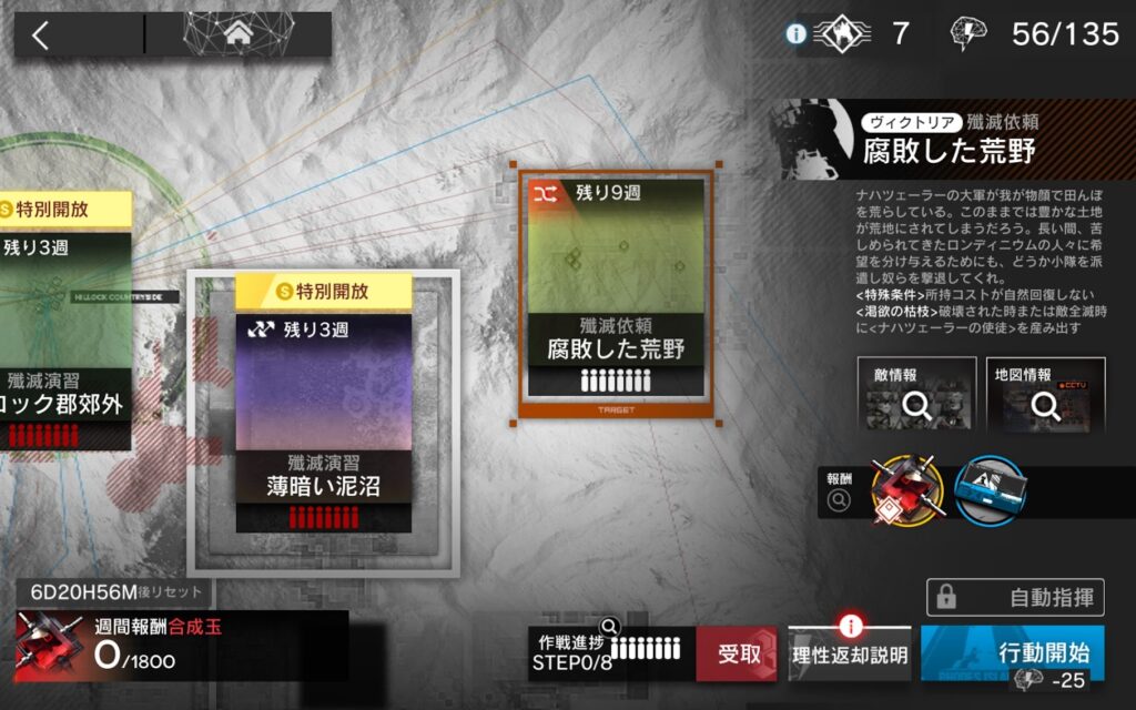 アークナイツにログインしたら、なんか?殲滅作戦に「腐敗した荒野」って新しいコンテンツが追加されていました。最初は気が付かなくて、「薄暗い泥沼」ってステージをオートスキップでクリアして合成玉をもらおうと思ってやっていたんですけど、何回やってもスキップが出来ないので、なんで?と思って確認したら、新規で「腐敗した荒野」が追加されているのを発見。