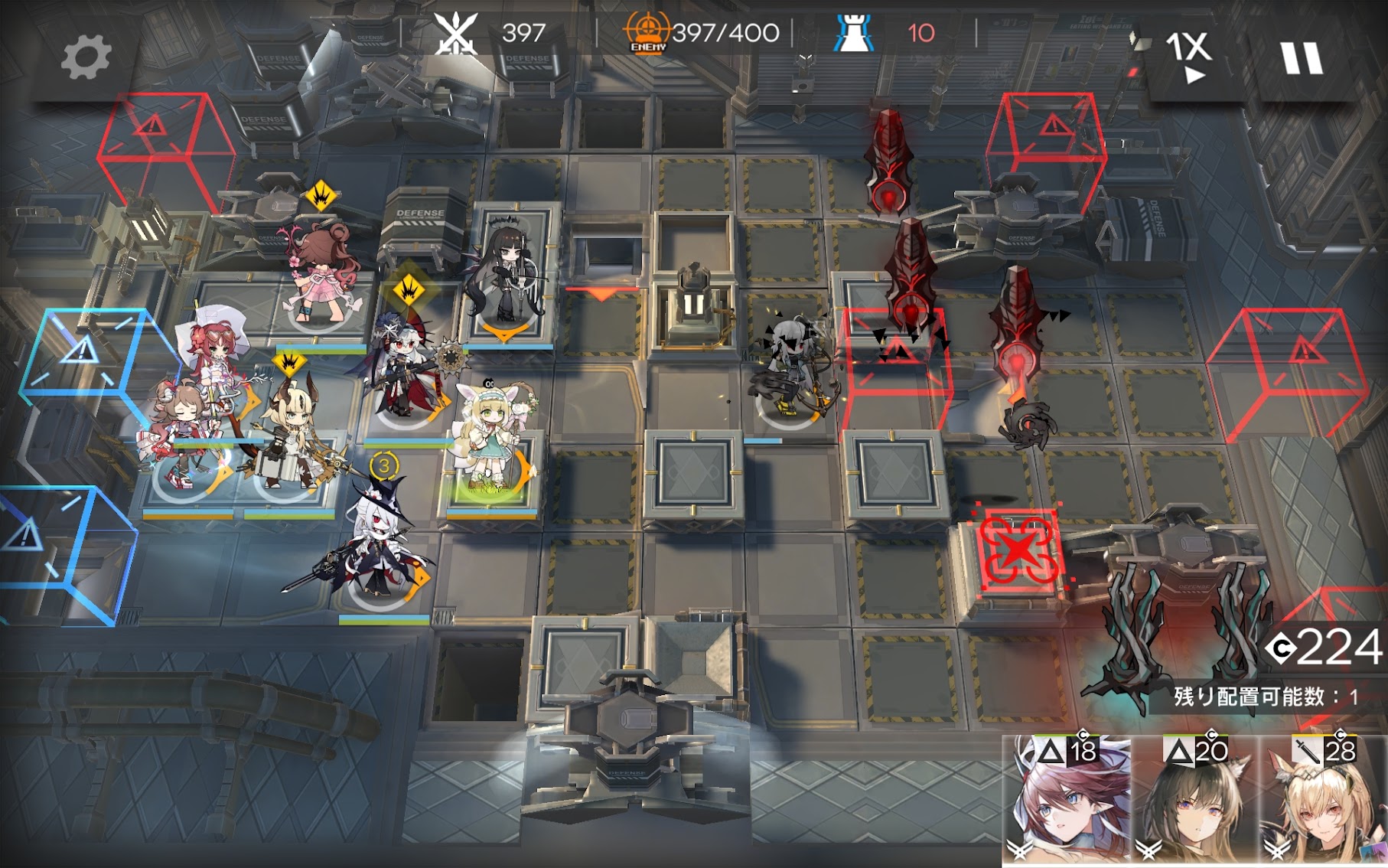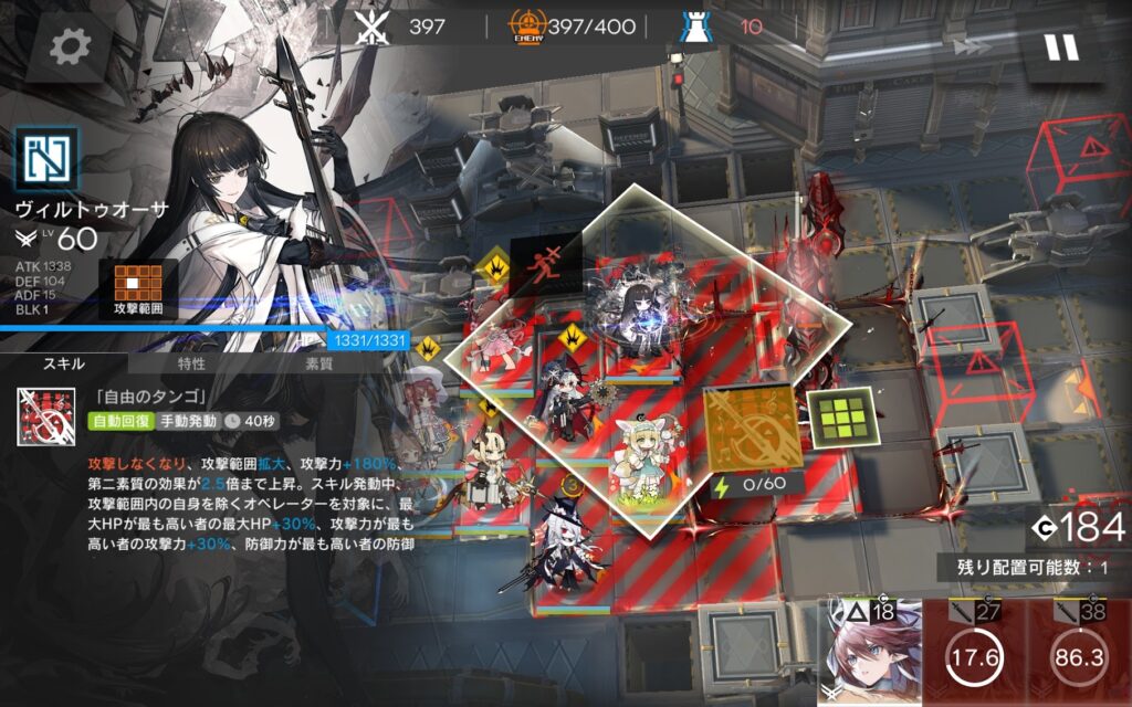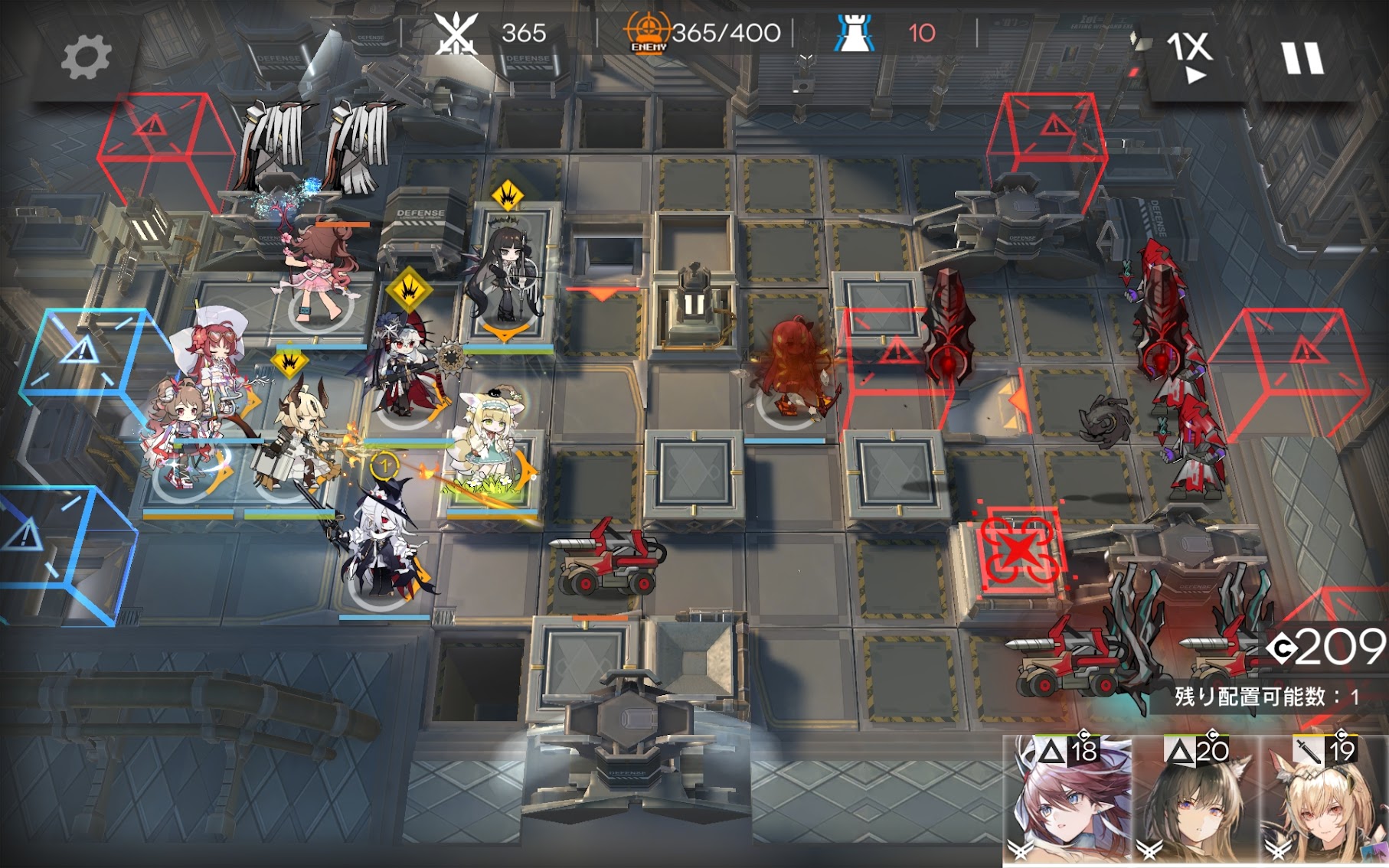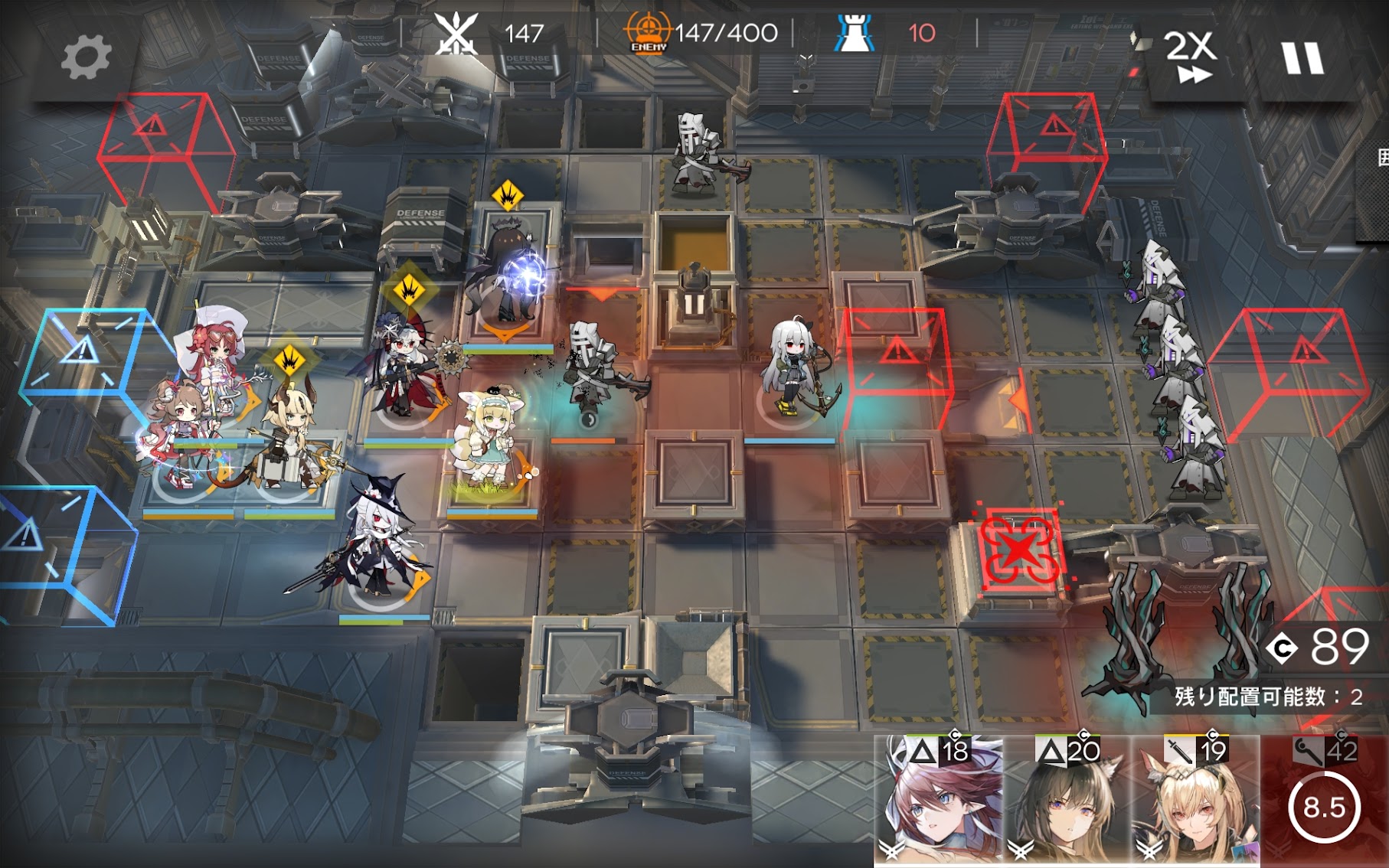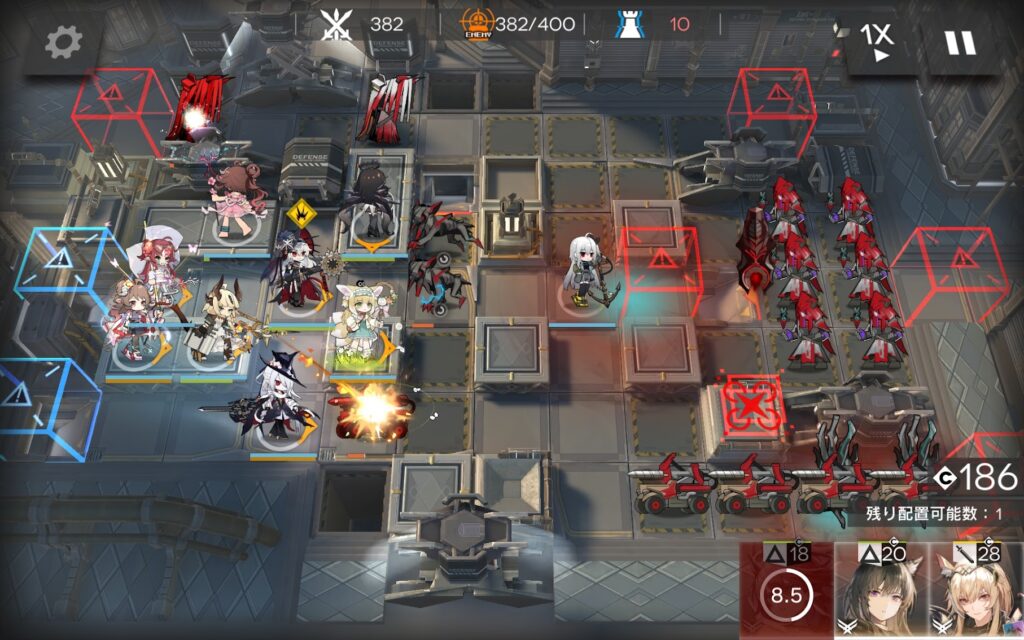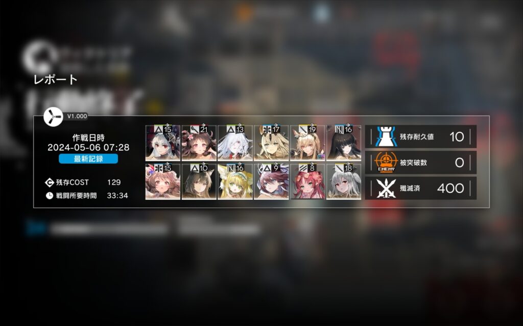 初見でやってみましたが、先鋒をテンニンカにしたのは失敗でした。殲滅作戦はコストの自動回復がないため、先鋒キャラが最低1体は必須になります。テンニンカはコスト回収能力が高い為、最適なコスト回収のキャラだと思いますが、手動でスキルを発動しないとコストを回収出来ない為、長期戦になる殲滅作戦では面倒くさくて操作が大変になります。忘れてましたよ。