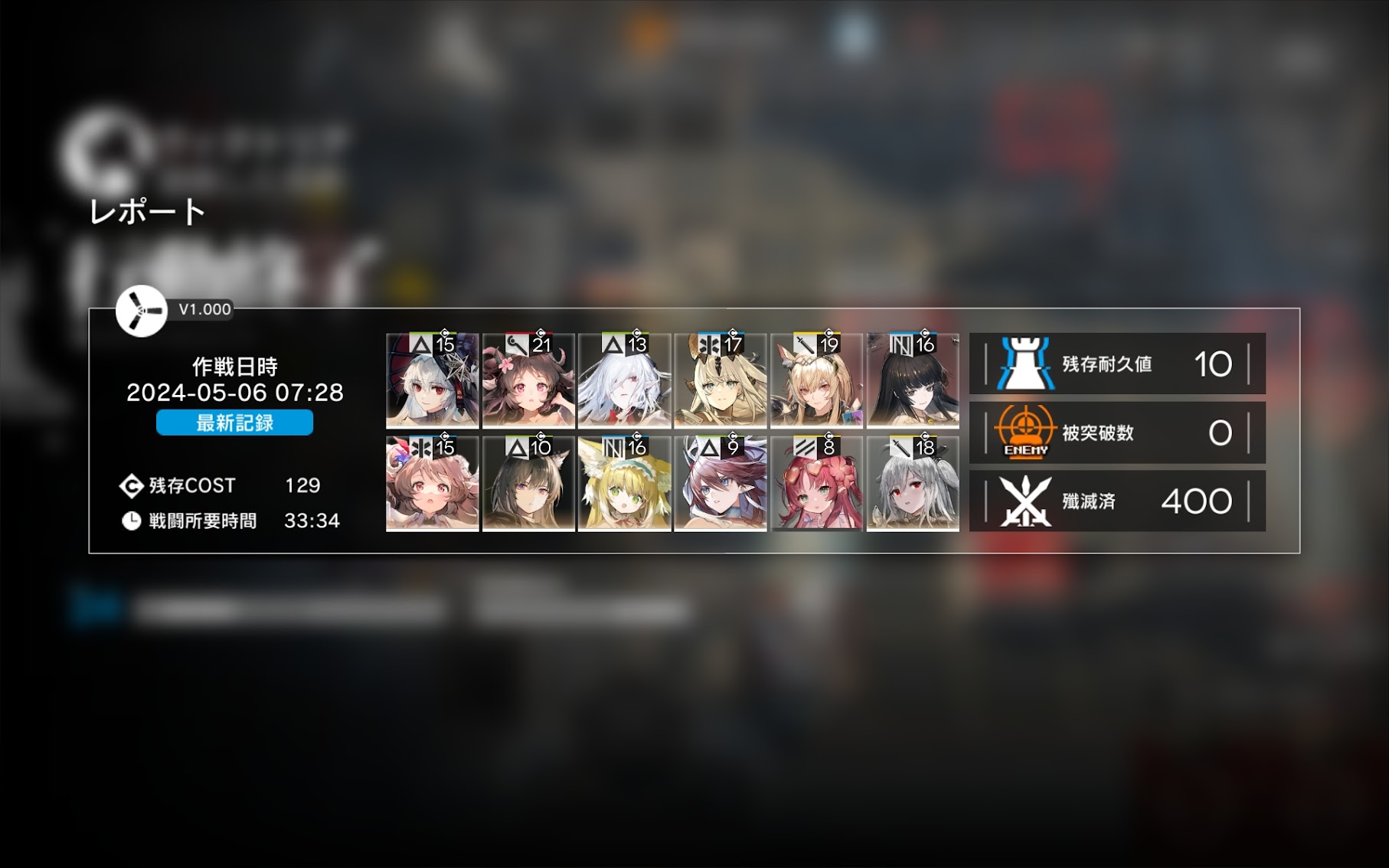 殲滅作戦ってスキップできるのは、新しく追加されたステージだけでしたっけ?、とにかく、この新しいステージをクリアしないとスキップが出来ない感じなのと、新規でクリアしたら報酬も沢山入手できて合成玉も1800個入手できますから、早速、やっていきます。編成はいつものアビサルメインの編成なのですが、今回は限定のヴィルトゥオーサとスズランを編成してみます。
