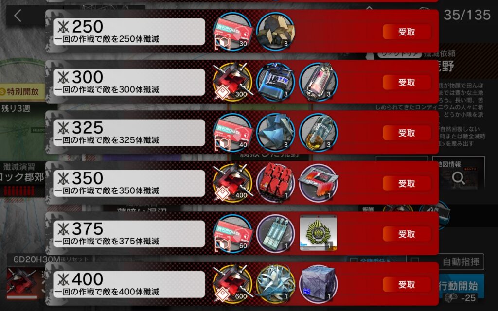 殲滅作戦では初回クリア時に、結構破格の報酬が入手できます。まあ、1回だけですけどね。これで、報酬も入手できて次回からはスキップクリアが可能になりました。ヴィルトゥオーサを育成して、スキルも特化3にした為、育成素材がすっからかんになってしまってます。まあ、育成する価値はありますので、スキル1、スキル3は特化3にしておいて、全く損はないと思います。